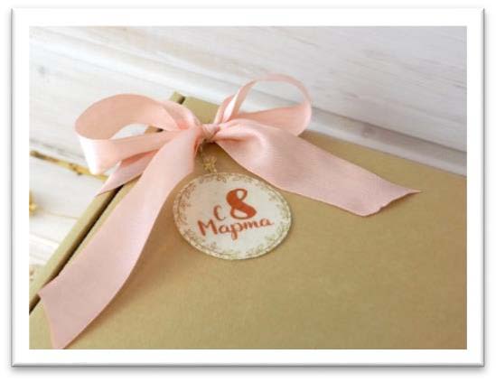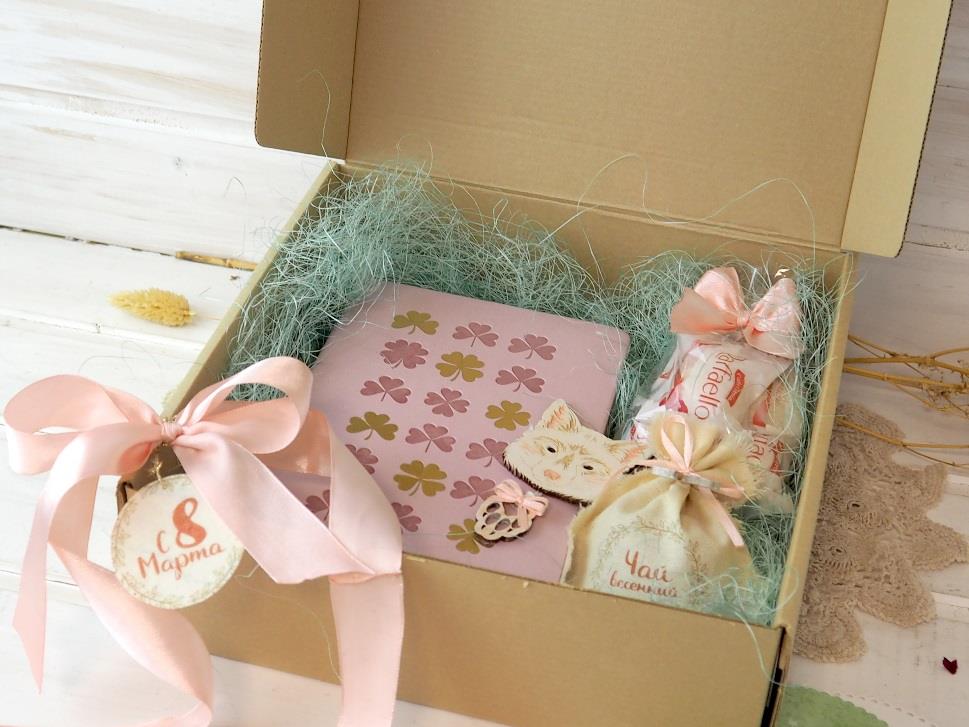 Упаковка – крафт-коробка с декором из атласной ленты и фильцевой мульки.
