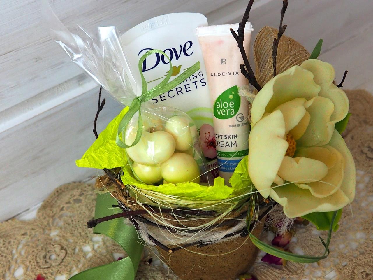 Упаковка — торфяной горшочек, декорированный натуральными материалами (береза, шерстяная нить, цветок из фетра), слюда с атласной лентой.