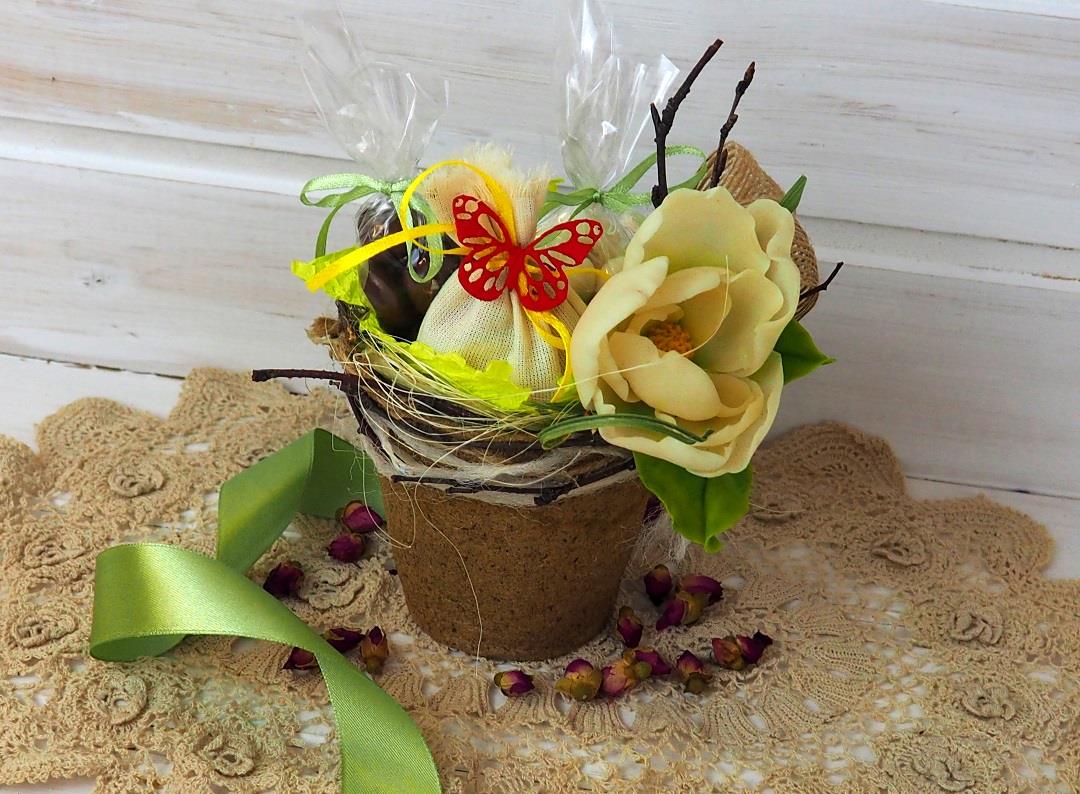 Упаковка — торфяной горшочек, декорированный натуральными материалами (береза, шерстяная нить, цветок из фетра), слюда с атласной лентой.