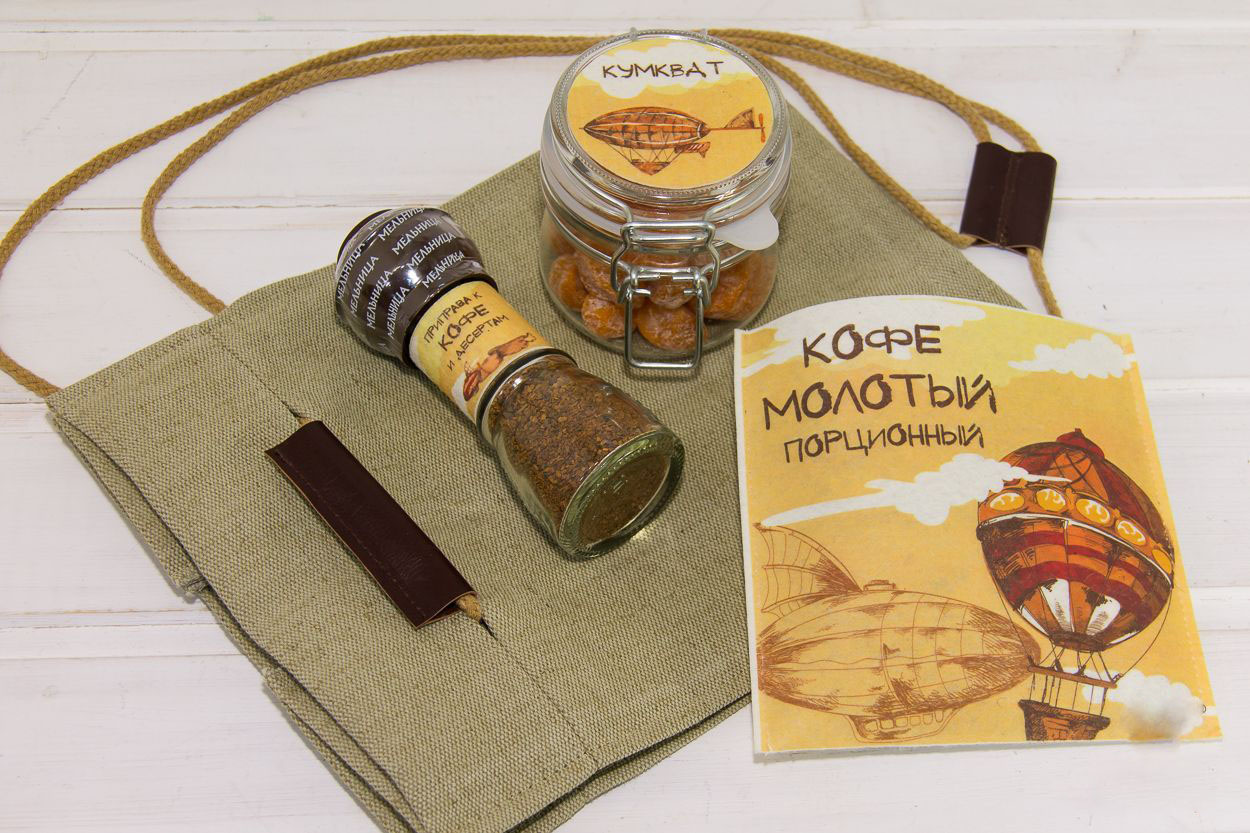 - баночка-мельница с приправой к кофе и десертам с этикеткой из фильца, рисунок выполнен термопечатью рисунка.