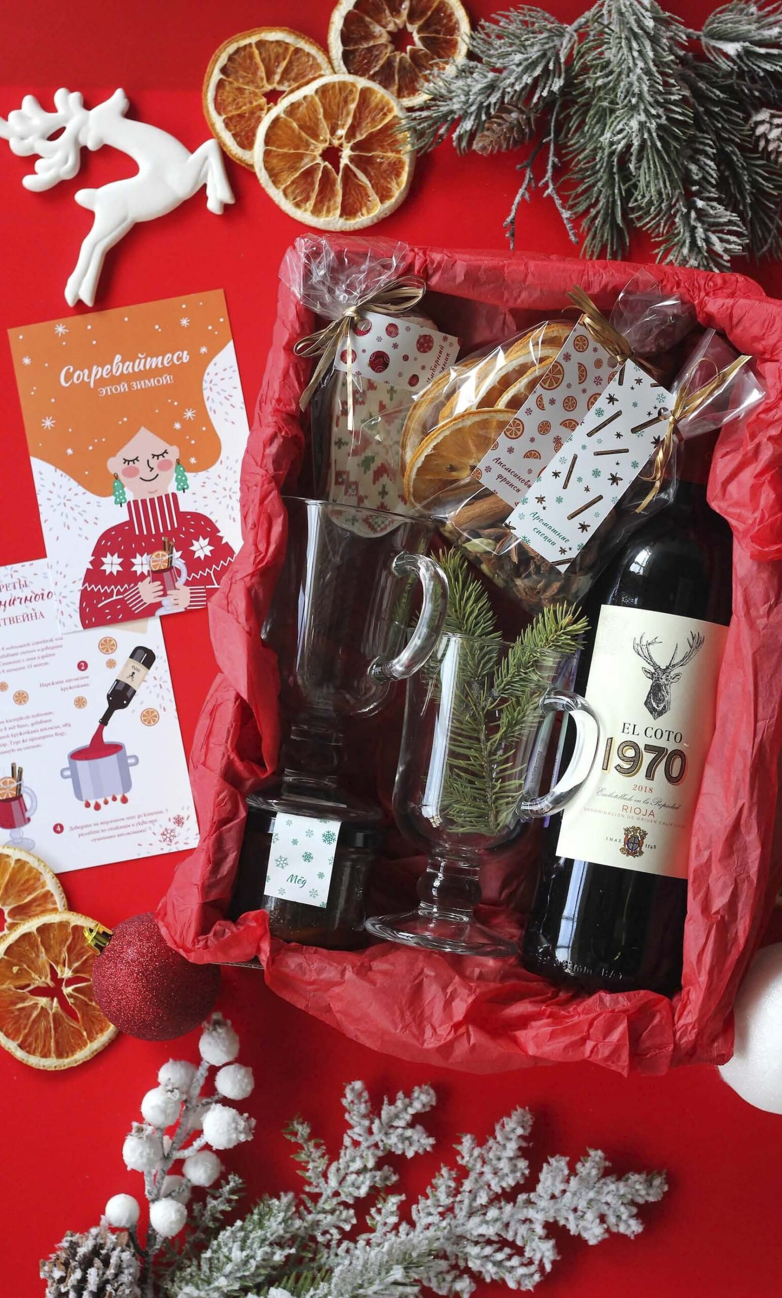 Большой набор для любимого зимнего праздника, с помощью которого можно приготовить глинтвейн с ароматными цельными специями, сушёными апельсинами, мёдом и насладиться радостными моментами в кругу семьи и друзей!