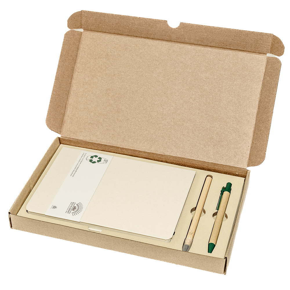 Подарочный набор в стильной картонной коробке бежевого цвета. Внутри на аккуратном ложементе располагаются ежедневник недатированный в твердом переплете и картонная ручка с колпачком.