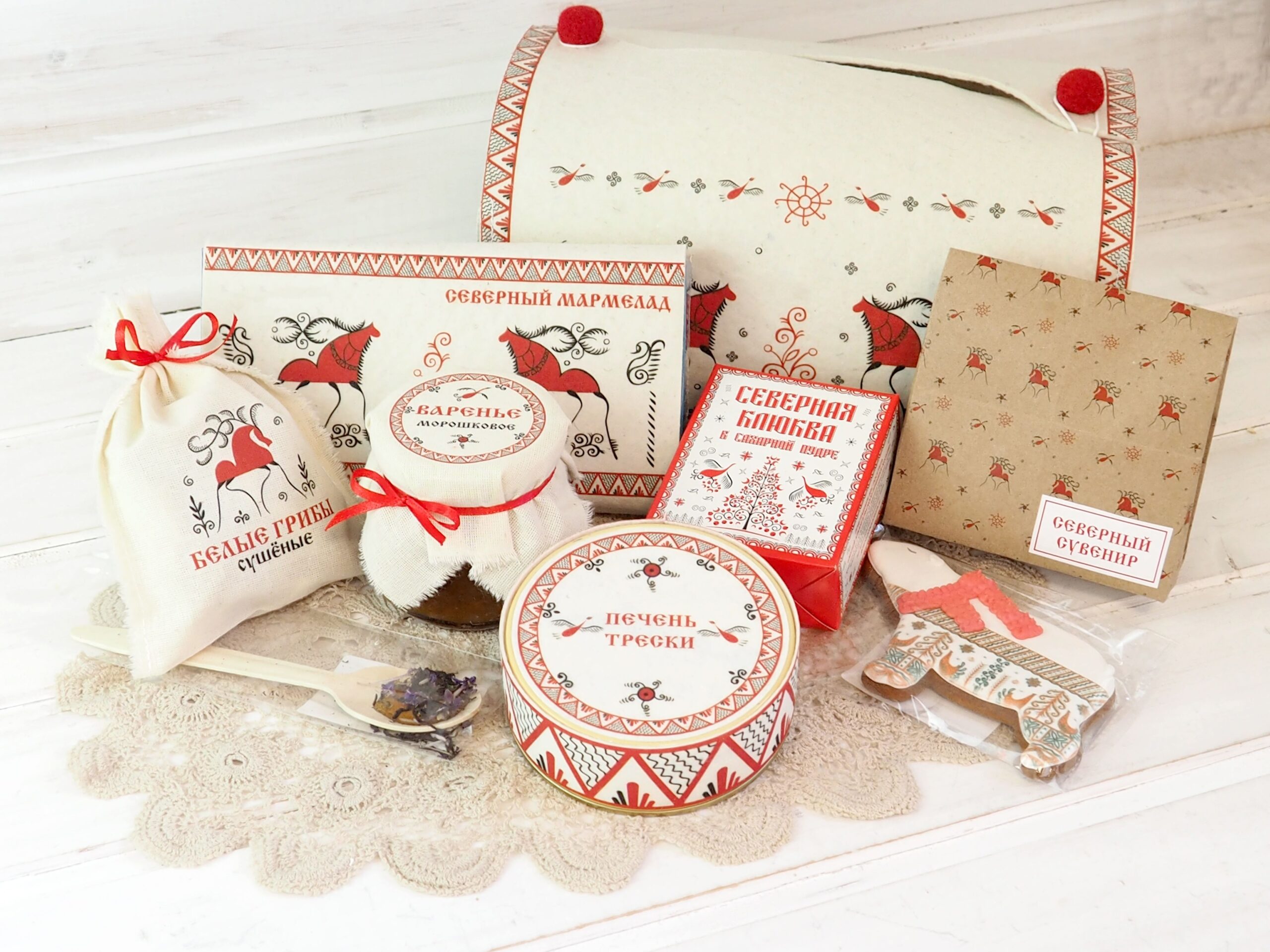 Предлагаем вам подарочные наборы с северными деликатесами и сладостями, упакованные с любовью и заботой в уютные ларчики и сумочки из натурального войлока.