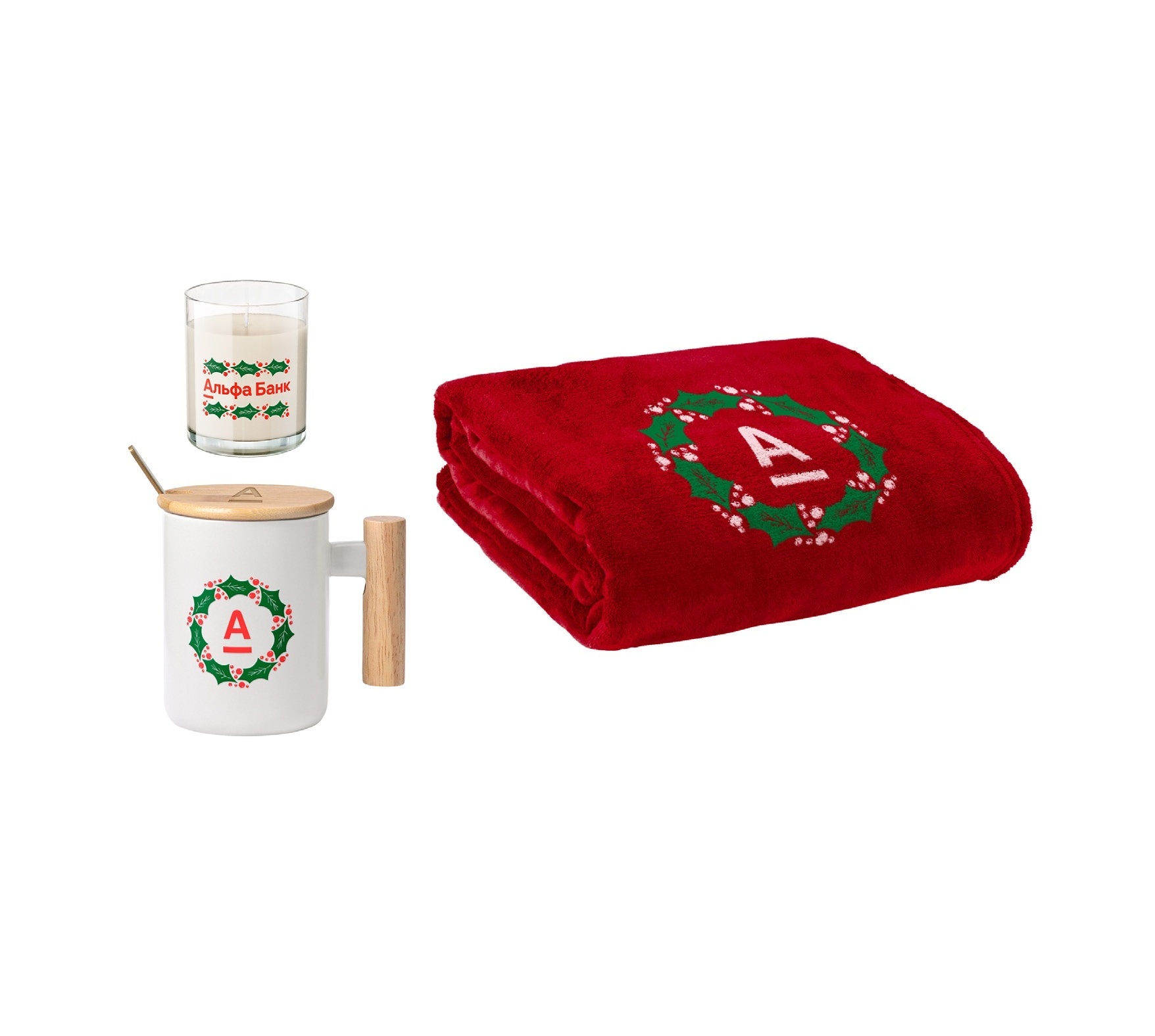 Подарочный набор для корпоративных клиентов, сочетающий уютный флисовый плед, эстетичную керамическую кружку с деревянной ручкой и ароматическую свечу в стеклянной ёмкости. Все элементы поддерживают кастомизацию бренда методами вышивки, печати или гравировки.