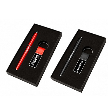 Классический корпоративный подарочный набор для мероприятий, включающий ручку и брелок в упаковке из чёрной PU-кожи. Все элементы поддерживают брендирование гравировкой и тиснением.