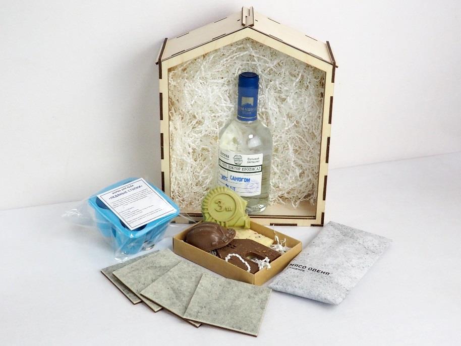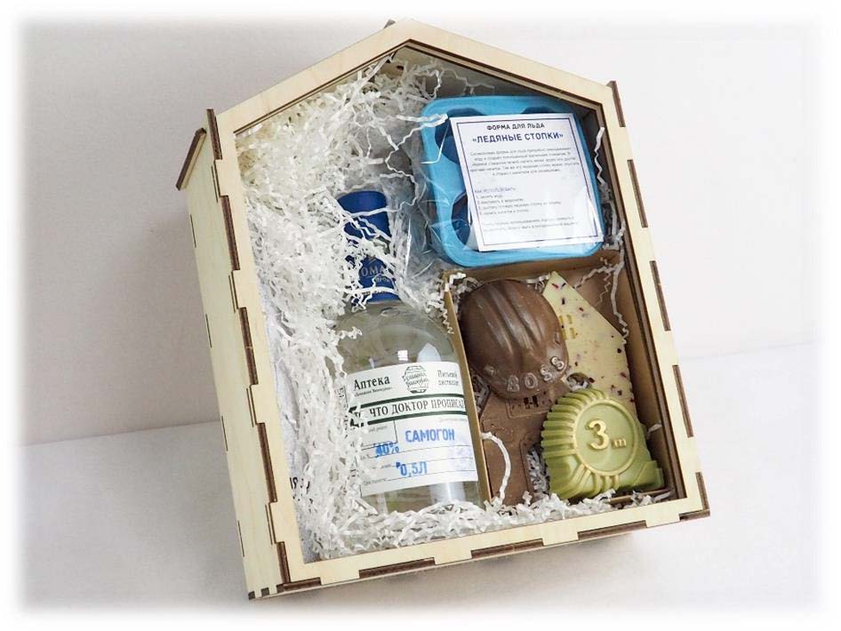 Упаковка — деревянный ящик с прозрачной крышкой с медведем и гравировкой (25х30х10 см).