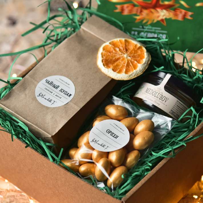 Внешне — совершенно традиционный подарок из чая, мёда и вкусняшки, но вкусовые качества наших подарков — в несколько раз выше, чем у других, то же относится и к качеству используемой нами продукции.