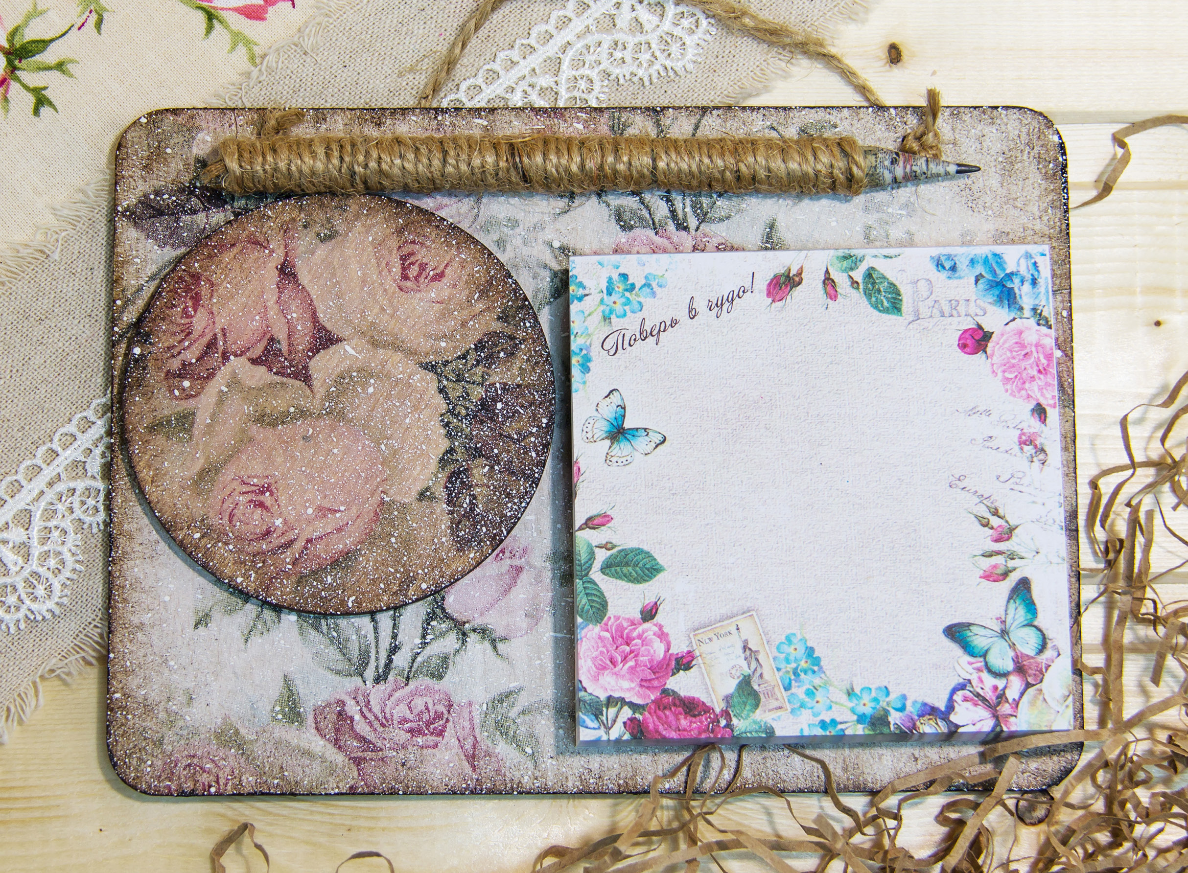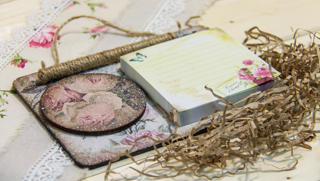 - магнит на холодильник на деревянной основе. Декор выполнен в технике «декупаж».