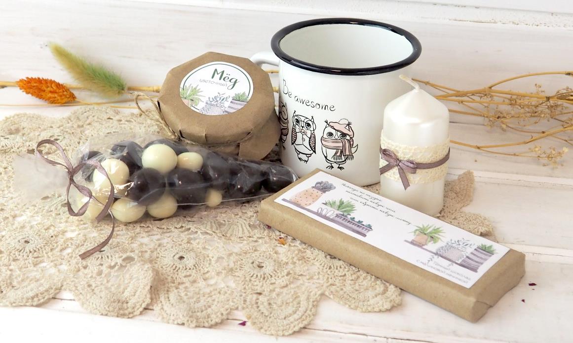 - мед цветочный в крафт-платочке с наклейкой;