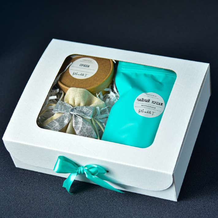 - белая коробка с пластиковым окошком