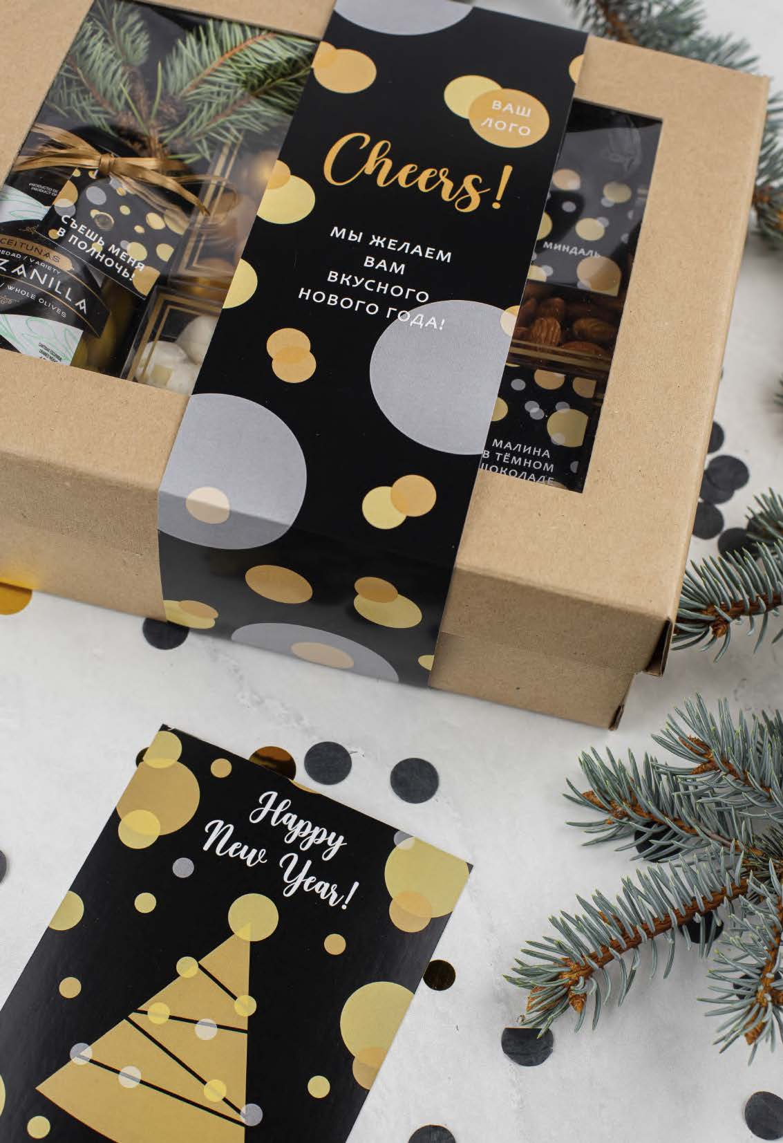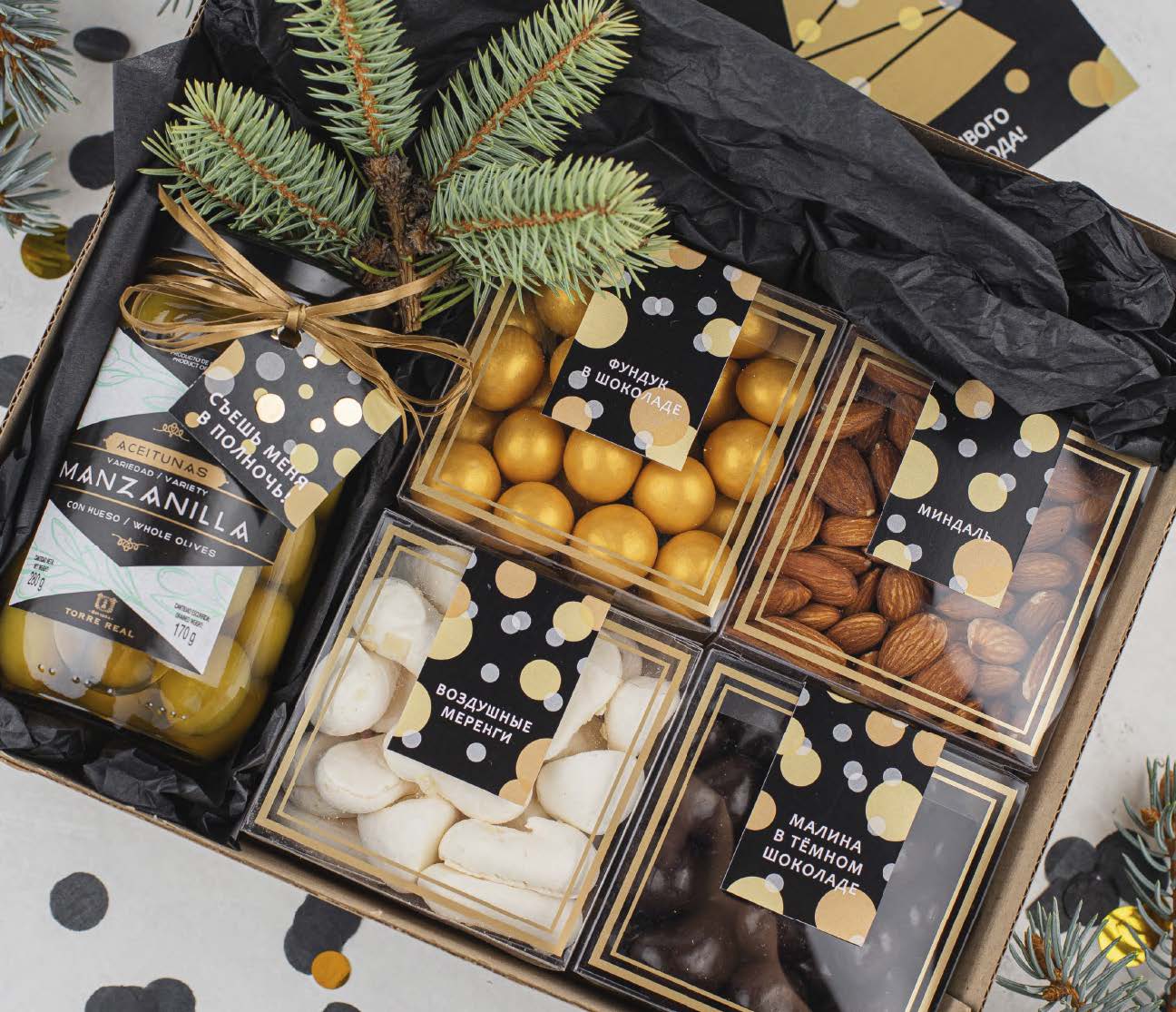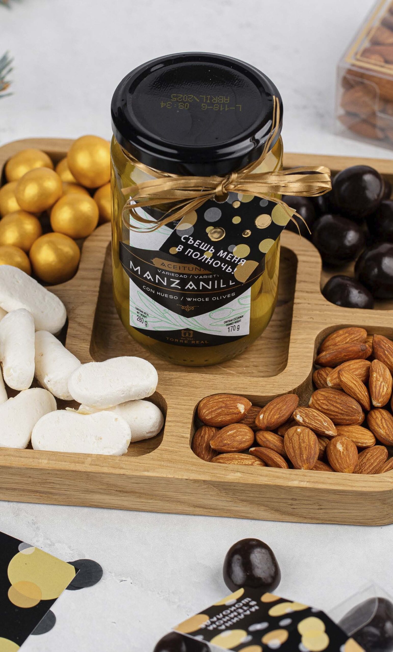 Новогодний подарочный набор со сладостями, миндалем и оливками. Внутри — деревянная менажница с вашей гравировкой для сервировки праздничного стола, много вкусностей и новогодняя открытка!