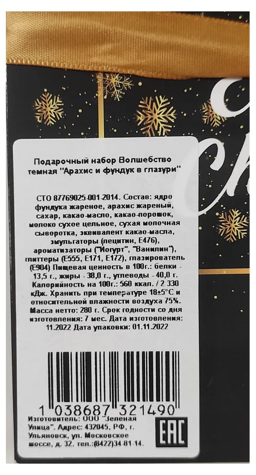 Состав: ядро фундука жареное, арахис жареный, сахар, какао-масло, какао-порошок, молоко сухое цельное, сухая молочная сыворотка, эквивалент какао-масла, эмульгаторы (лецитин, Е476), ароматизаторы («Йогурт», «Ванилин»), глиттеры (Е555, Е171, Е172), глазирователь (Е904)