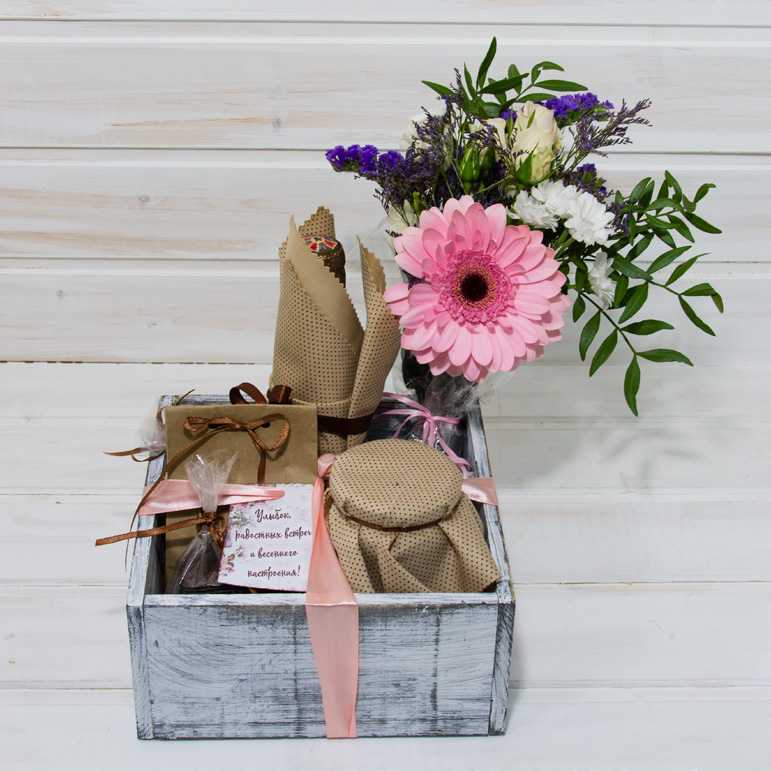 Упаковка — деревянный ящик, перевязанный атласной лентой с подарочной открыткой