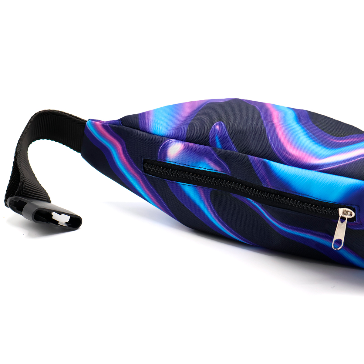 Полноцветная печать по всей поверхности от шва до шва. Возможны любые оттенки по CMYK: логотипы, надписи и разнообразные принты. Односторонняя сублимация. Вместительная поясная сумка закрывается на молнию и имеет карман на задней стенке. Регулируемый поясной ремень на защёлке-фастексе.