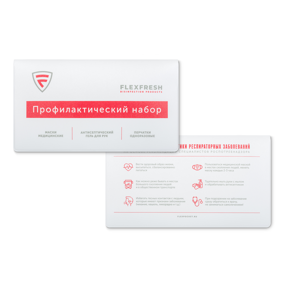 В основу изготовления профилактического набора взят материал ПВХ, использование которого позволяет нанести на обложку стильный и оригинальный принт, а также логотип компании, инструкцию по применению или текст с мерами предосторожности.