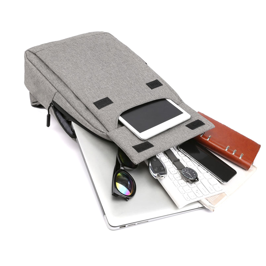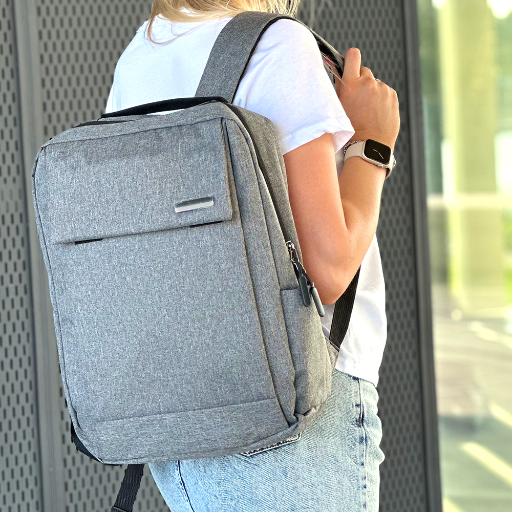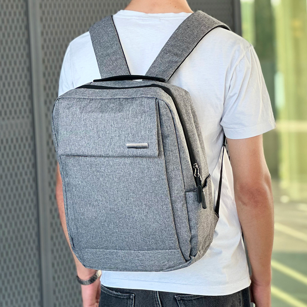 Одно большое отделение закрывается молнией со скрытым звеном. Внутри большой уплотненный карман для ноутбука 15,6 дюймов с клапаном-резинкой на велькро и карман-органайзер для мелких аксессуаров. На передней стенке большой карман с клапаном на велькро. Сбоку открытый карман и USB-разъем с проводом для подключения внешнего аккумулятора. Уплотнённая короткая ручка для дополнительного комфорта рук. Уплотнённые плечевые ремни регулируются по длине.