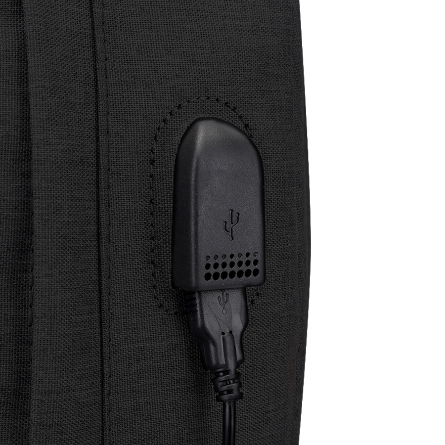 На передней стенке два кармана на молниях, один из них скрытый. Сбоку два открытых кармана и USB-разъем с проводом для подключения внешнего аккумулятора.