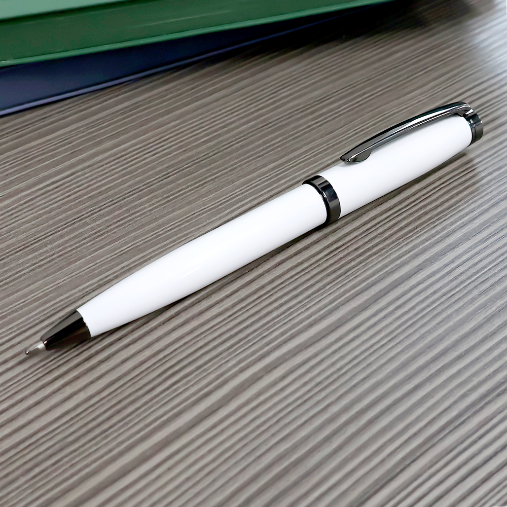 Наша Бетти — подарок для любителей более увесистых и солидных форм. Общий вес ручки — 33 грамма! У нашей красотки поворотный механизм, покрытый глянцем корпус из нержавеющей стали, стержень Паркер 0,7 мм с синими чернилами. Элементы ручки: клип, кольцо и дюбка покрыты ган-метал краской. Ручку приятно держать в руке и демонстрировать публике.