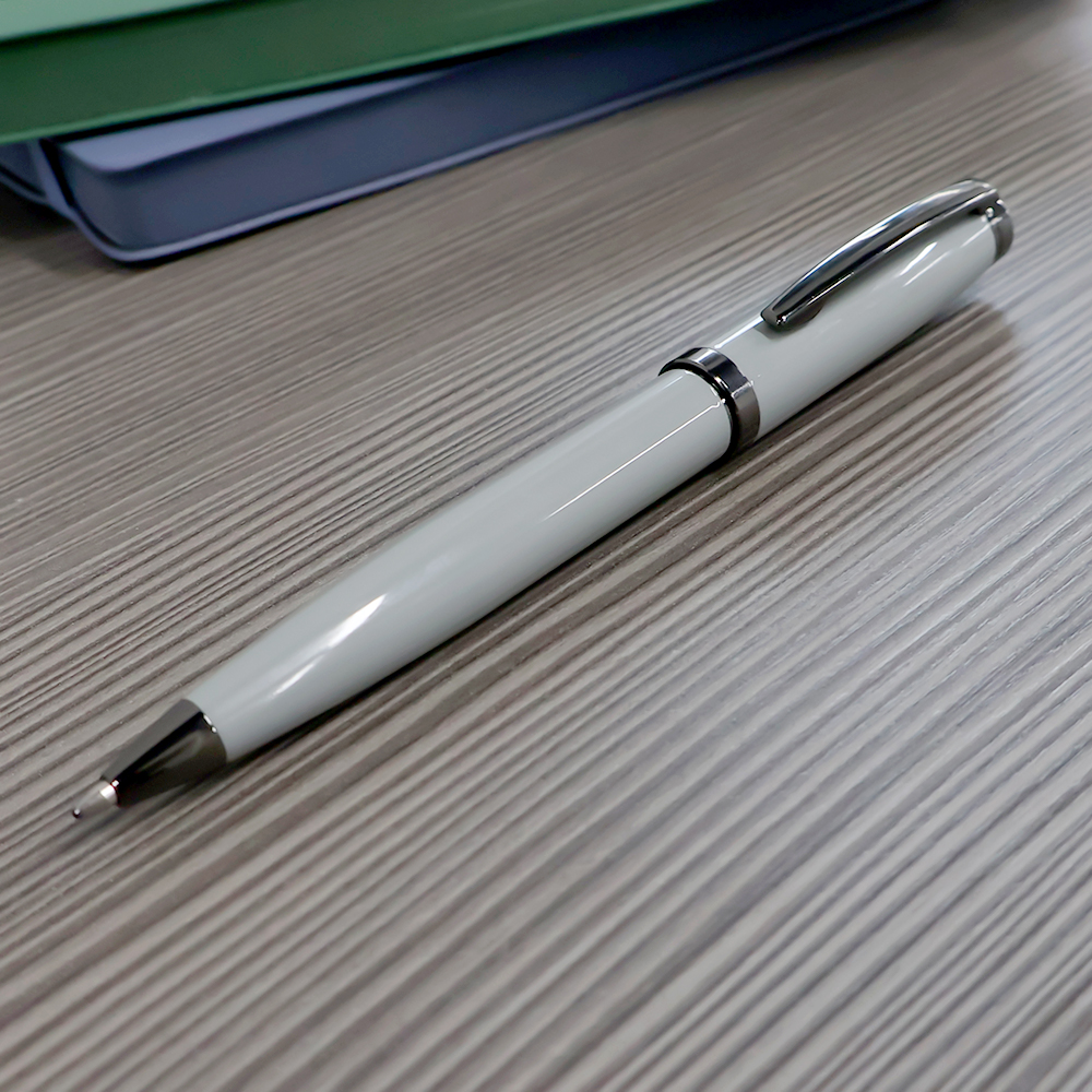 Наша Бетти — подарок для любителей более увесистых и солидных форм. Общий вес ручки — 33 грамма! У нашей красотки поворотный механизм, покрытый глянцем корпус из нержавеющей стали, стержень Паркер 0,7 мм с синими чернилами. Элементы ручки: клип, кольцо и дюбка покрыты ган-метал краской. Ручку приятно держать в руке и демонстрировать публике.