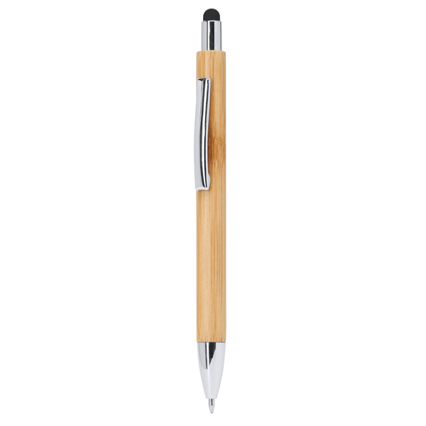 Шариковая ручка Eco line с бамбуковым корпусом, цветным указателем и металлическим клипсом. Серебристая кнопка, клип и наконечник. Прозрачная заправка jumbo диаметром 1,0 мм с синими чернилами.