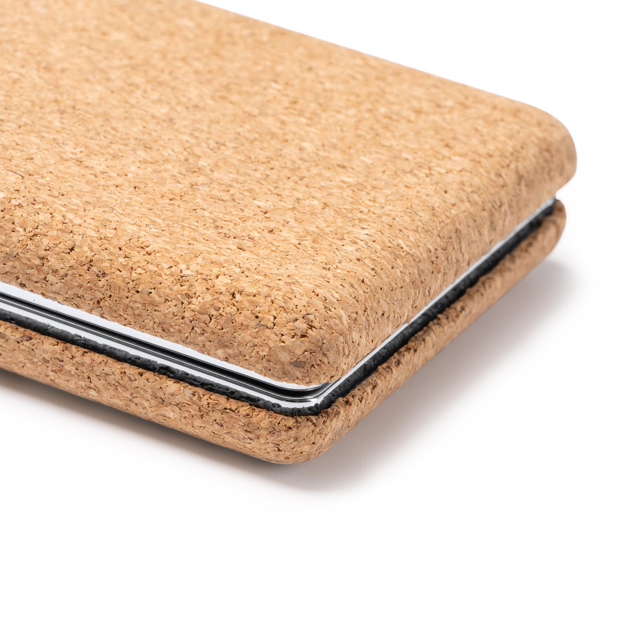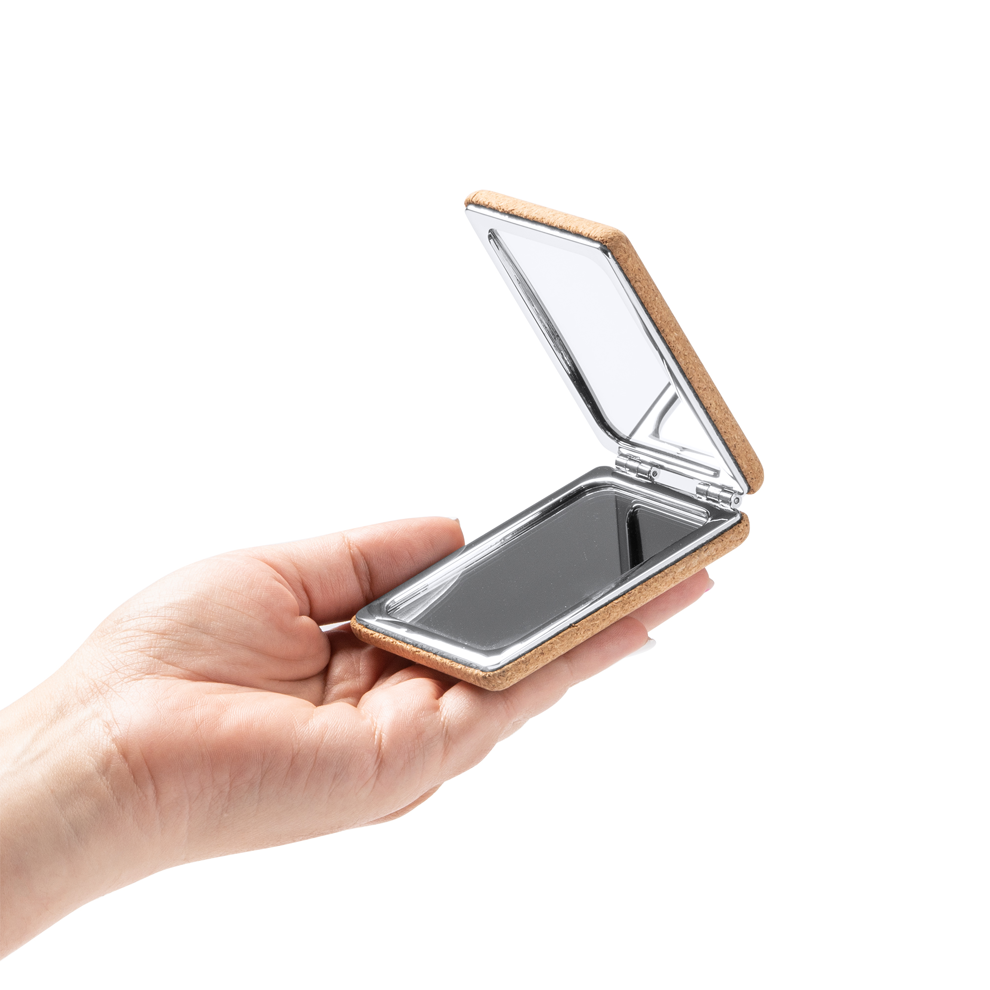 Карманное складное зеркало из натуральной пробки с хромированной металлической отделкой — это элегантный и экологичный вариант, который можно всегда носить с собой.