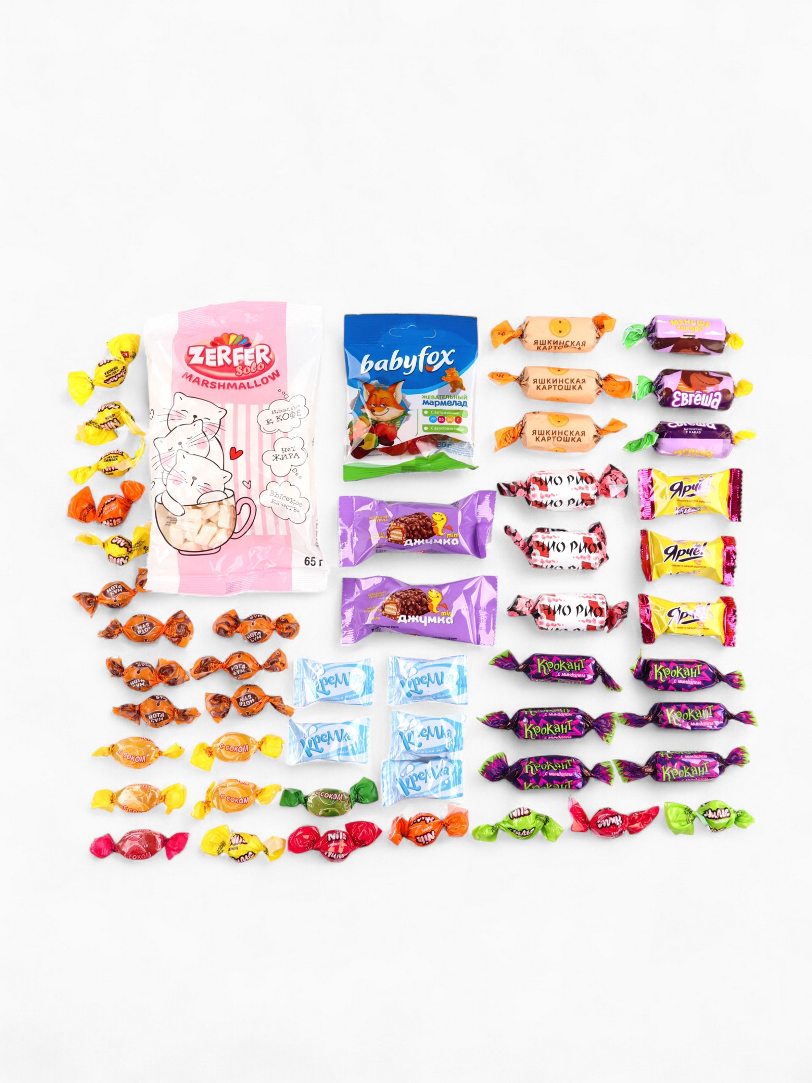 Состав: сахар, патока, масла растительные (антиокислитель: токоферолы, концентрат смеси), крахмал кукурузный, стабилизатор – гуммиарабик, влагоудерживающие агенты: сорбитовый сироп, лактат натрия; регуляторы кислотности: кислота молочная, лимонная кислота; желирующий агент – пектины, концентрированные соки яблока, чёрной моркови, красители: куркумин, экстракт паприки, синий блестящий FCF; ароматизаторы, эмульгатор – лецитин соевый. Может содержать диоксид серы, следы глютена, яиц, молока, арахиса, орехов и продуктов их переработки.
