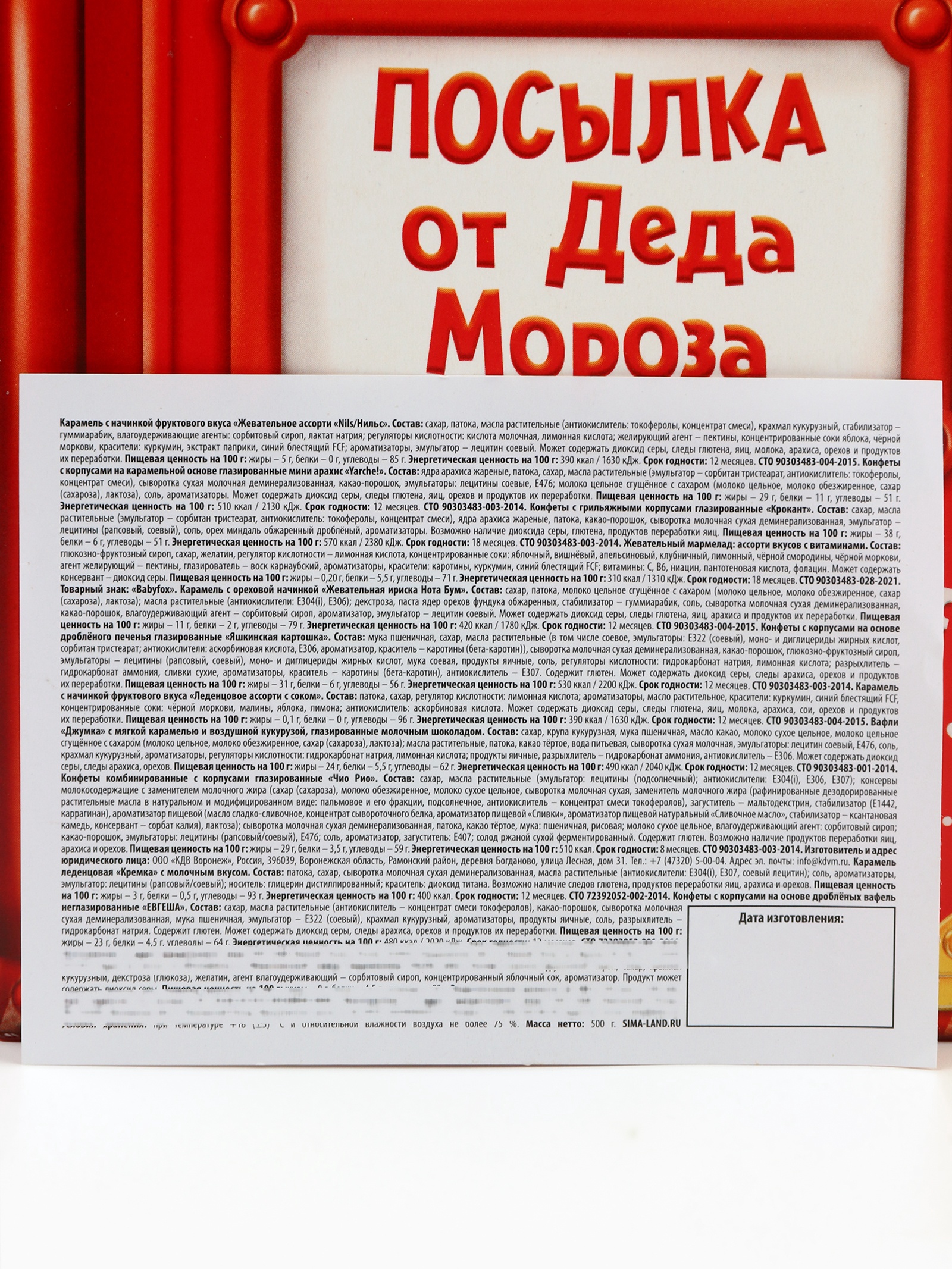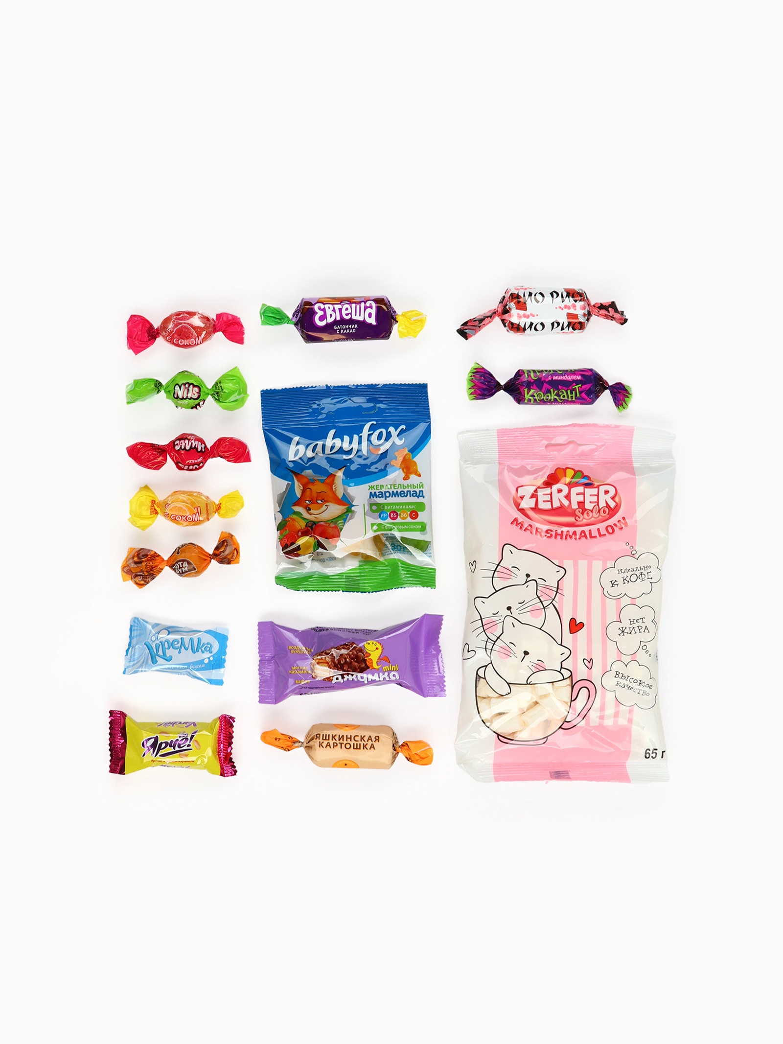 Состав: сахар, патока, масла растительные (антиокислитель: токоферолы, концентрат смеси), крахмал кукурузный, стабилизатор – гуммиарабик, влагоудерживающие агенты: сорбитовый сироп, лактат натрия; регуляторы кислотности: кислота молочная, лимонная кислота; желирующий агент – пектины, концентрированные соки яблока, чёрной моркови, красители: куркумин, экстракт паприки, синий блестящий FCF; ароматизаторы, эмульгатор – лецитин соевый. Может содержать диоксид серы, следы глютена, яиц, молока, арахиса, орехов и продуктов их переработки.