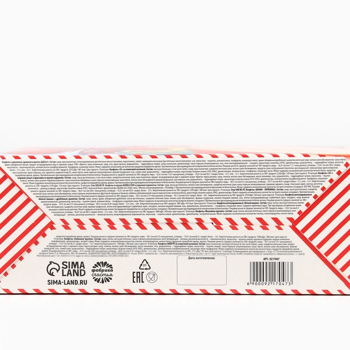 Состав: сахар, патока, масла растительные, молоко сухое обезжиренное, сыворотка молочная сухая, крахмал кукурузный, агенты влагоудерживающие (сорбитовый сироп, глицерин), желатин пищевой говяжий, соль, ароматизатор, антиокислитель – токоферолы, концентрат смеси. Содержит сорбитовый сироп. При чрезмерном употреблении может оказывать слабительное действие. Может содержать незначительное количество продуктов переработки сои, экстракта ячменно-солодового. Противопоказано при индивидуальной непереносимости белка молока.