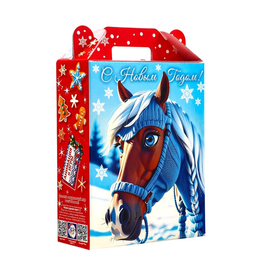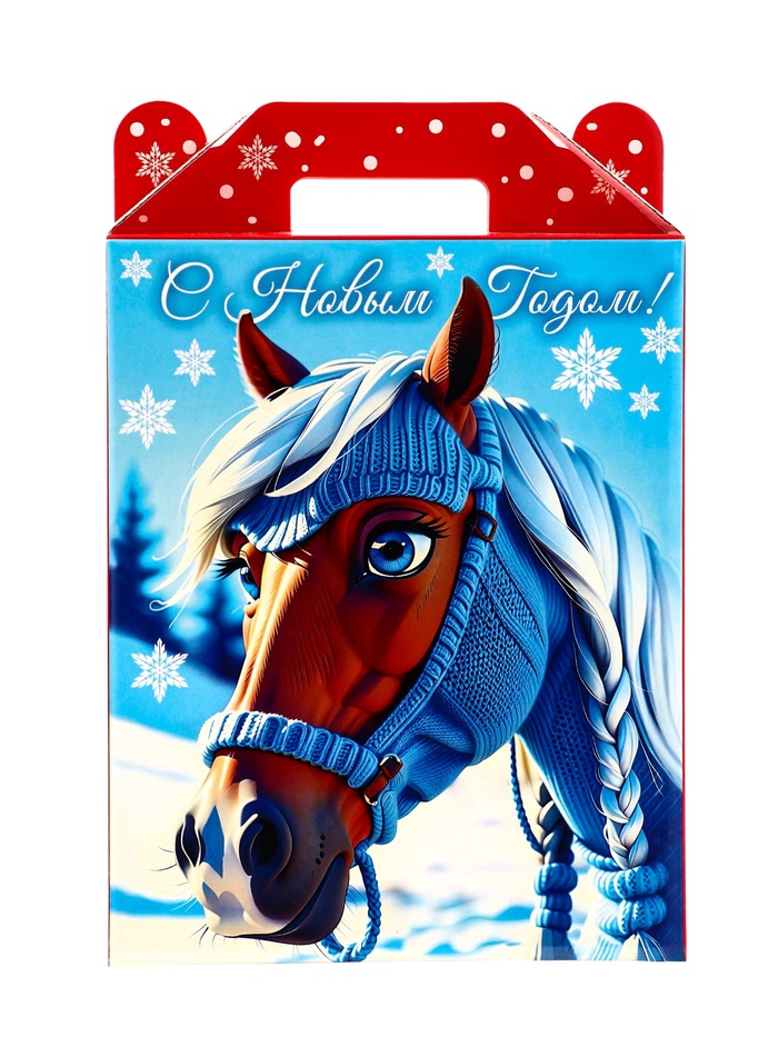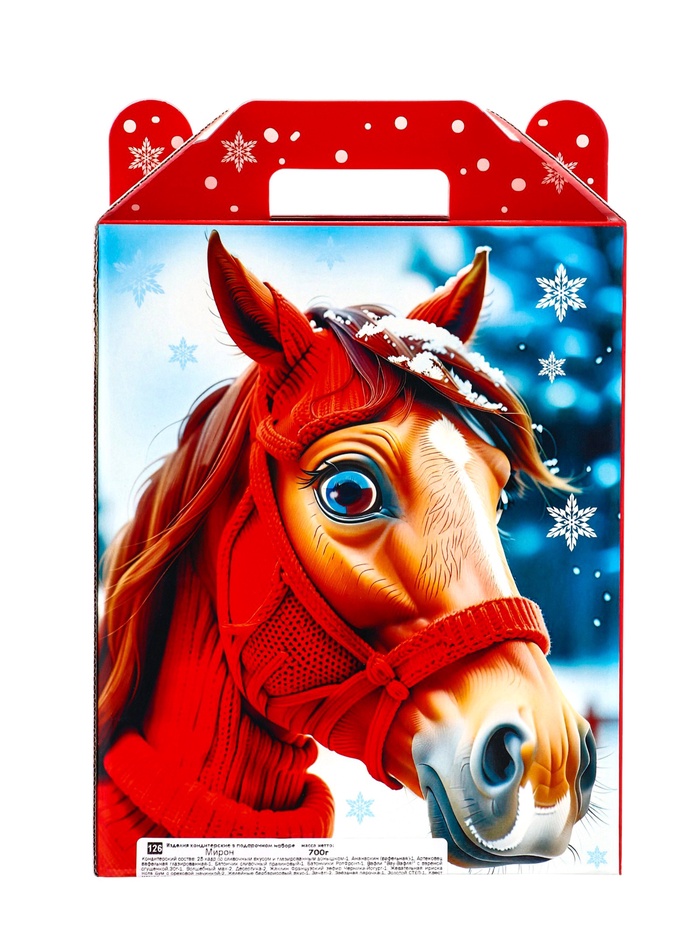 - Картонная коробка с дизайном символа года: Упаковка оформлена в стилистике символа 2026 года.