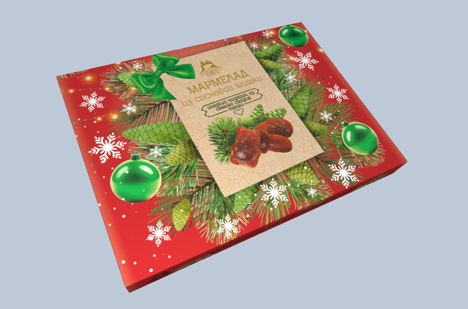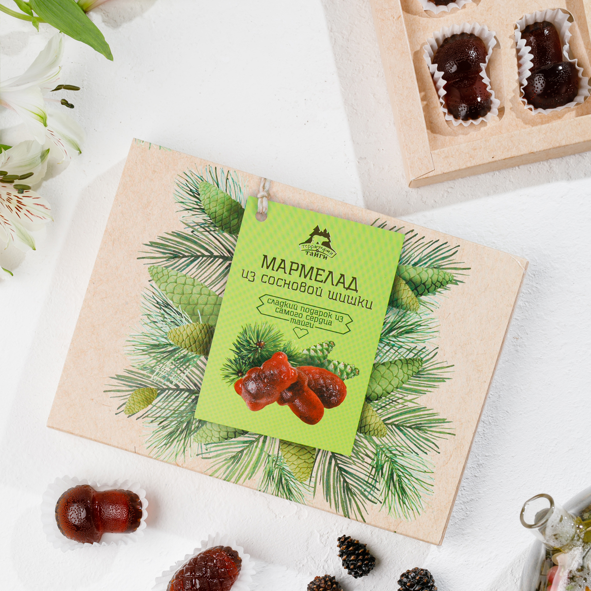 Состав: патока, сосновый сироп (сахар, молодые сосновые шишки, вода, лимонный сок), сахар, вода, загуститель: пектин цитрусовый, регулятор кислотности: лимонная кислота, глянцеватель (растительное масло, карнаубский воск, пчелиный воск). Возможно наличие следов кедрового ореха.