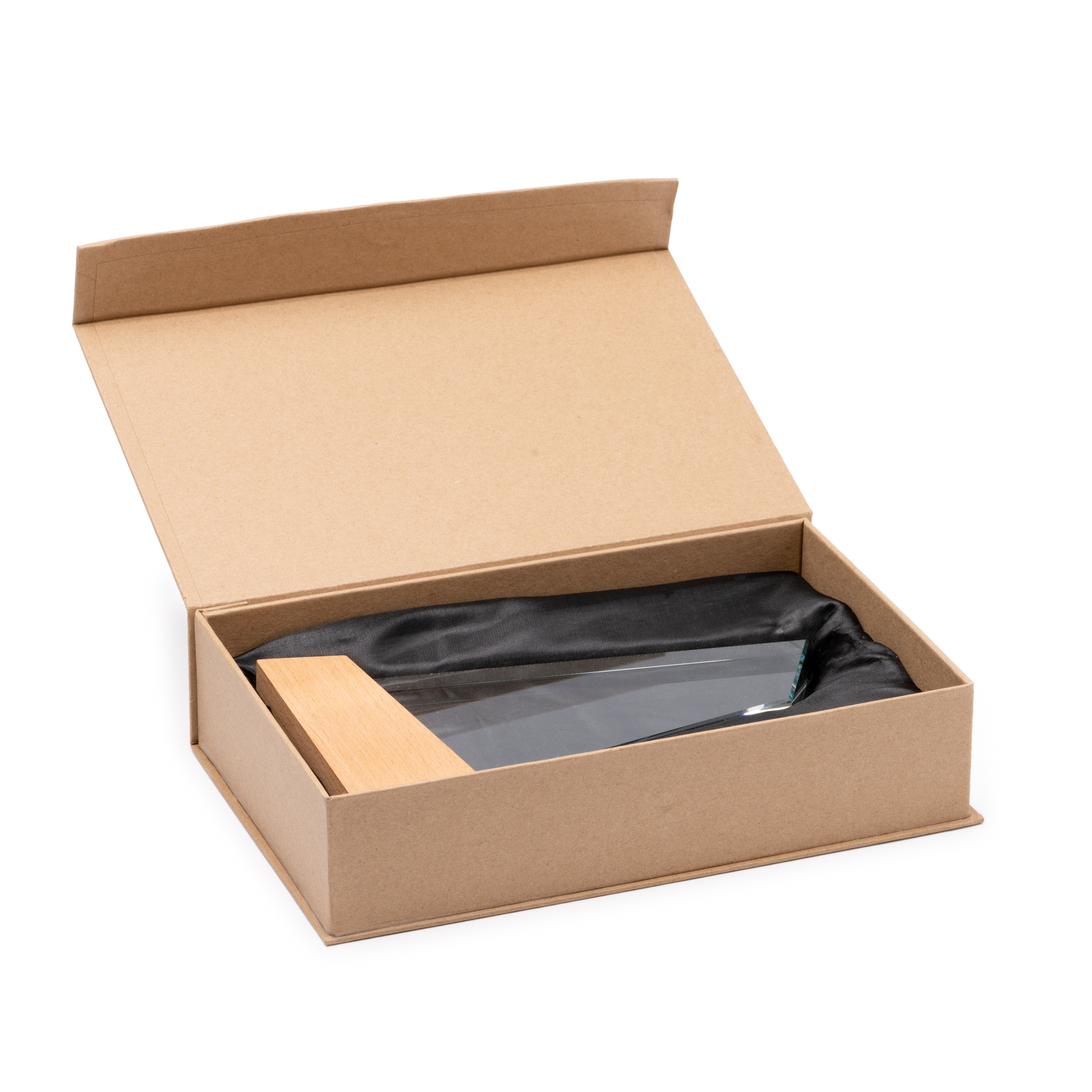 Стеклянная награда с морским дизайном с бамбуковым основанием. Включает крафтовый презентационный футляр.
