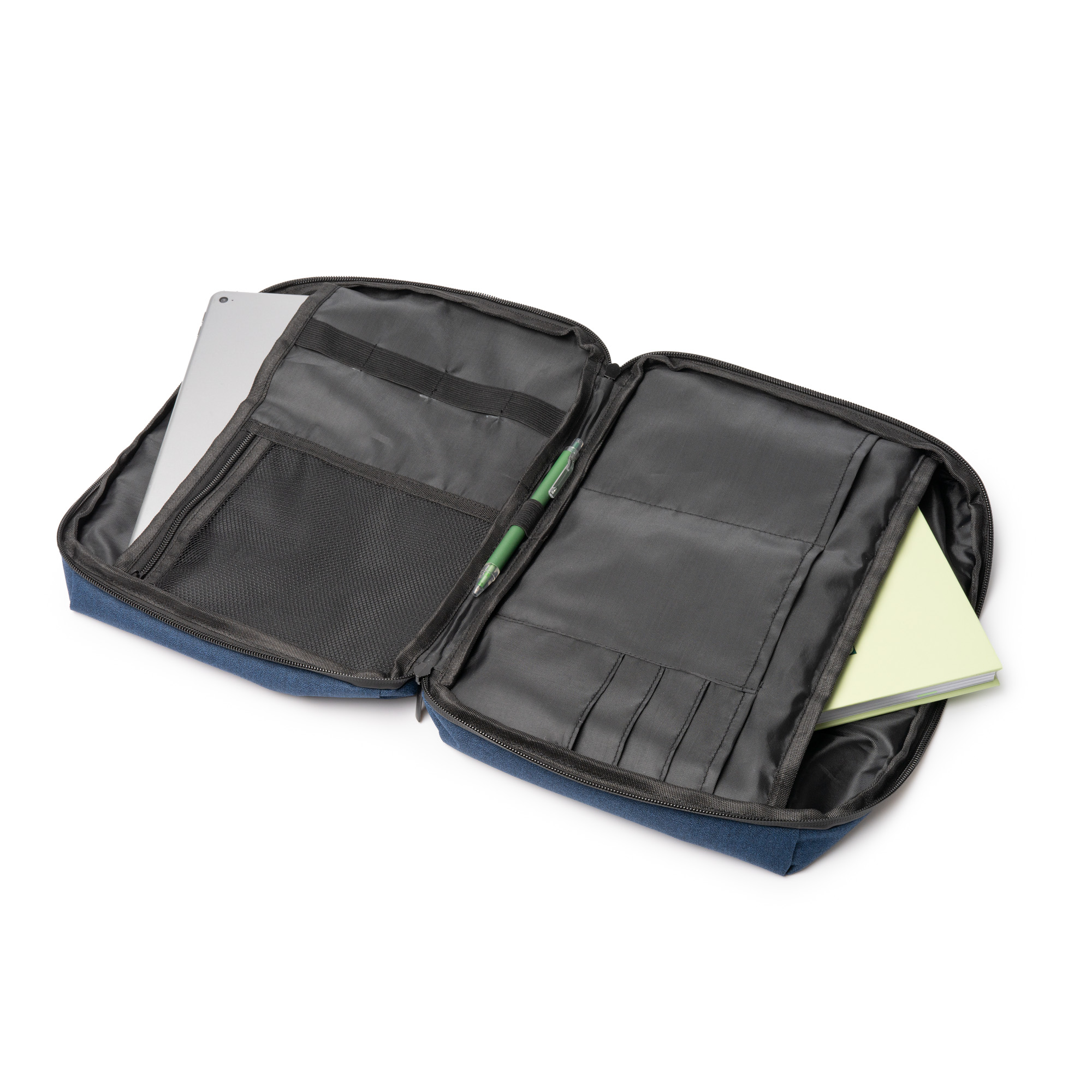 Сумка с двумя внутренними отсеками для ноутбуков до 12″, из RPET 300D и ПВХ. Ткань и застежки-молнии обладают водоотталкивающими свойствами. Молния полностью открывается. Включает дополнительные карманы среднего и малого размера, а также сетчатое тканевое отделение с застежкой-молнией. Несколько эластичных крепежных ремней для крепления небольших вещей. Большой внешний карман на застежке-молнии, что делает его практичным вариантом.