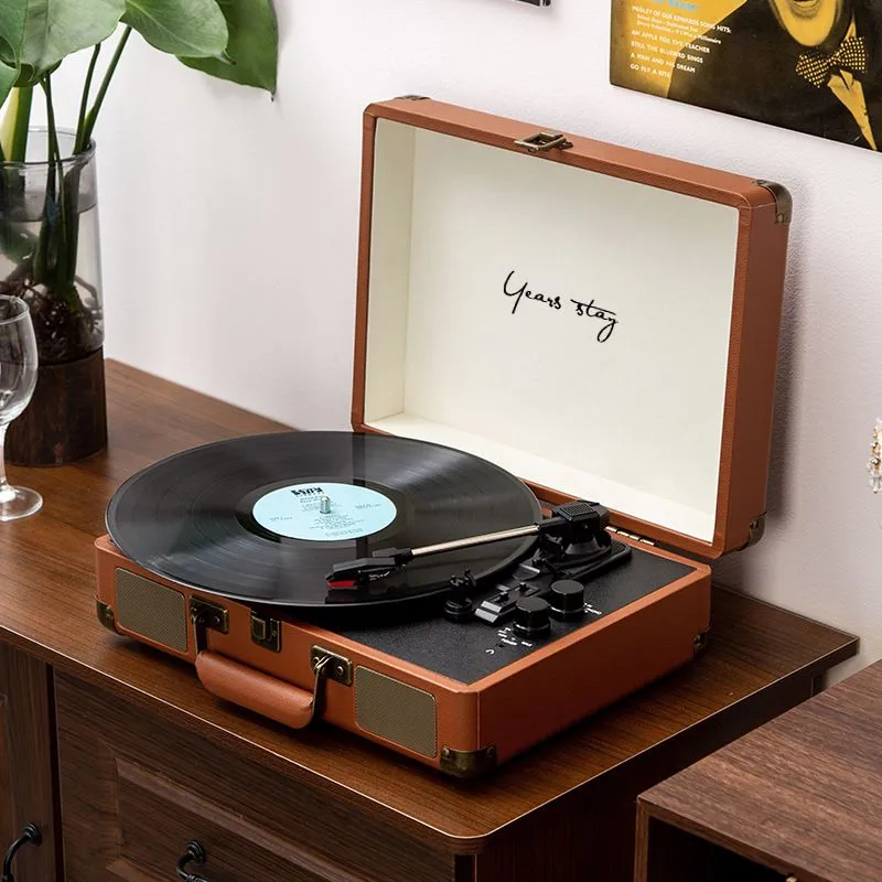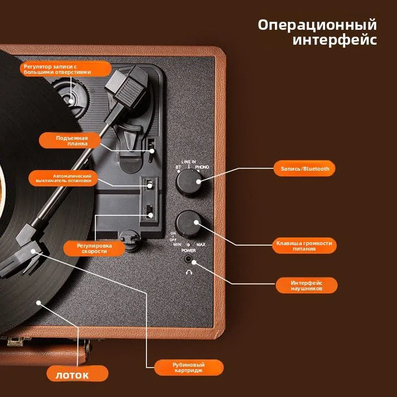Виниловый проигрыватель — это модель, в которой нет ничего лишнего. Настоящее воплощение ретро-стиля, современных технологий, простоты и удобства в использовании. Преимущества и функционал проигрывателя в стиле винтаж: Возможность подключения цифровых устройств по беспроводному каналу Bluetooth (блютуз): наслаждайтесь плейлистом с вашего телефона. Разъем AUX, вход 3.5 мм и RCA порт, позволяющие слушать любимую музыку через гарнитуру, наушники, mp3 плеер, CD плеер, портативную колонку, домашнюю музыкальную стерео систему. Ременной привод, обеспечивающий равномерное воспроизведение звука. Три скорости воспроизведения (33 , 45, 78 об/мин). Керамическая игла с алмазным напылением. Встроенные полнодиапазонные 2-дюймовые динамики 2х5 Вт. Для прослушивания подходят все актуальные размеры пластинок (7, 10, 12 дюймов).