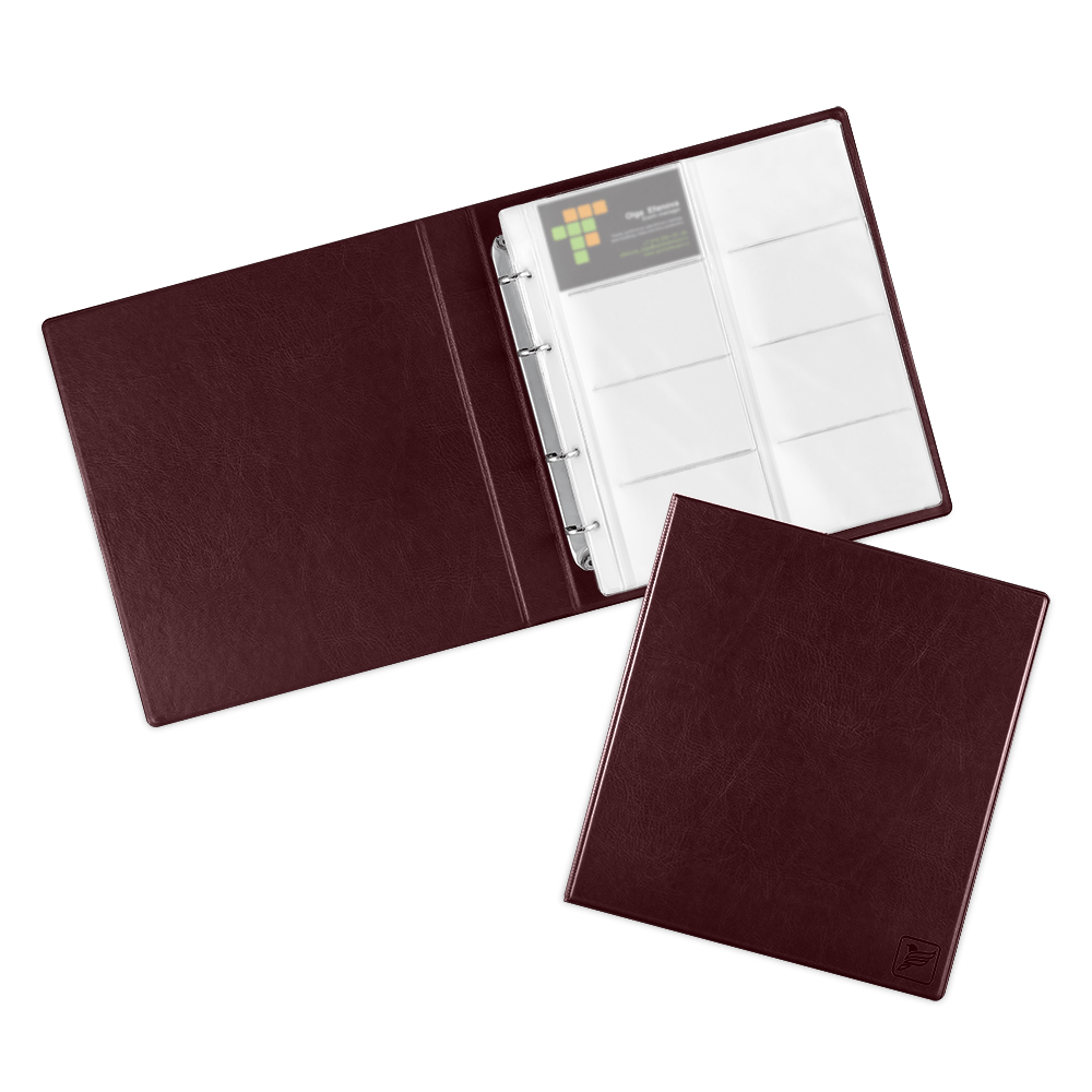 Вертикальная настольная визитница из мягкой экокожи имеет внутренний блок, рассчитанный на 160/320 визиток. Каждый лист вмещает восемь визиток или банковских карт стандартного размера, но при необходимости, каждое отделение с легкостью поместит две визитные карточки. Визитница выполнена на кольцах, что облегчает доступ к листам и их сортировку.
