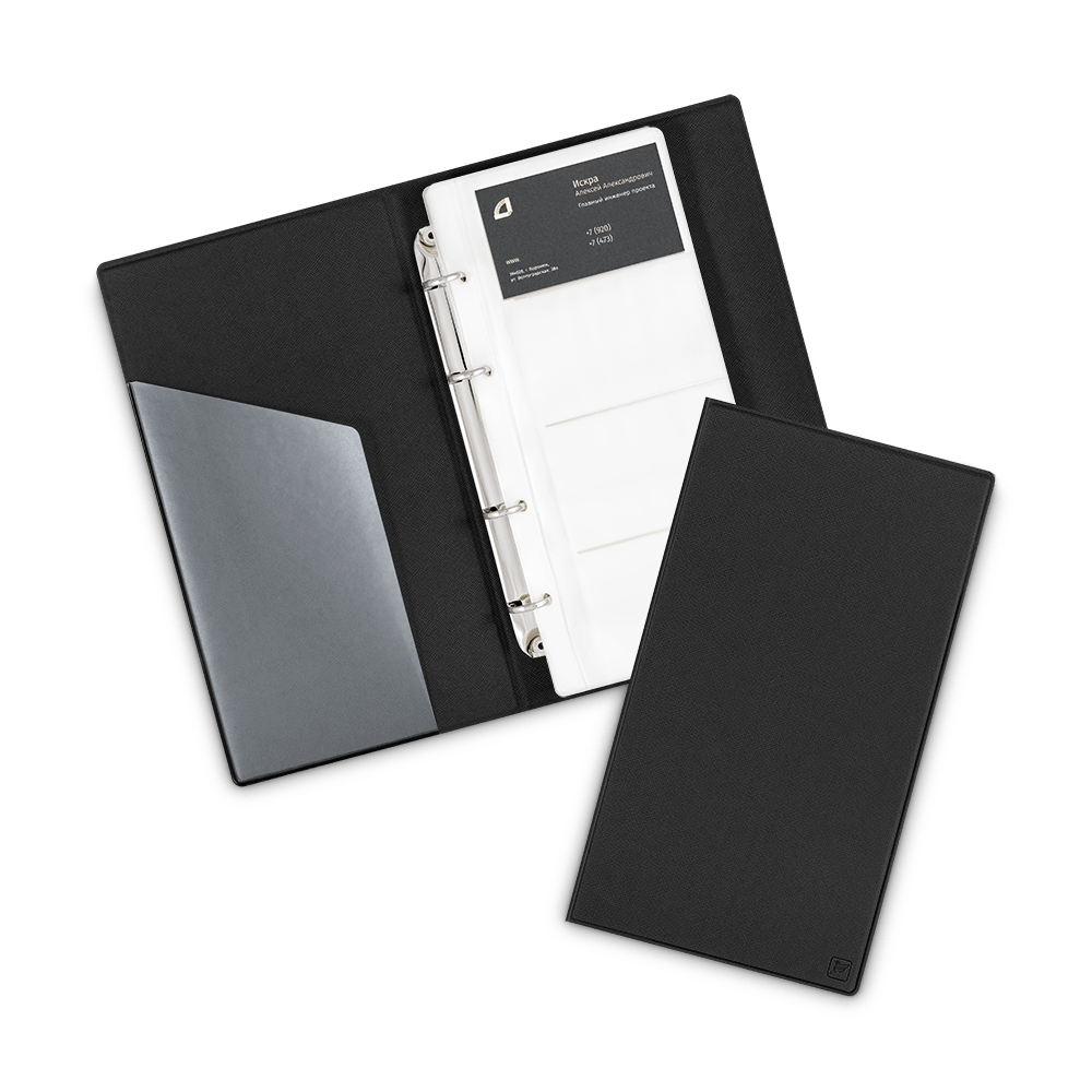 Вертикальная настольная визитница из мягкой экокожи имеет внутренний блок рассчитанный на 80/160 визиток. Каждый лист вмещает четыре визитки или банковские карты стандартного размера, но при необходимости, каждое отделение с легкостью поместит две визитные карточки. Визитница выполнена на кольцах, что облегчает доступ к листам и их сортировку.