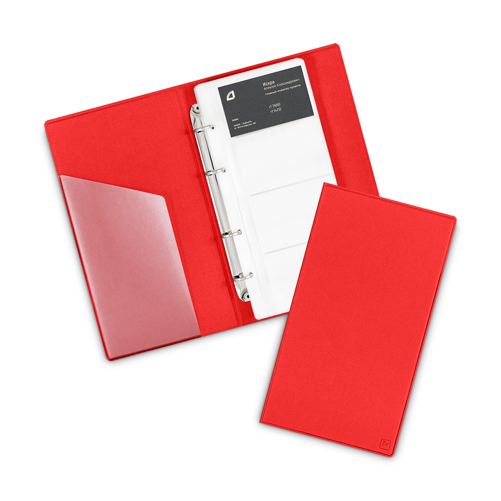 Визитница на кольцах, в отличии от большой визитницы, имеет компактный вид. Это удобный аксессуар из экокожи, который позволит вам грамотно распределить до 80 визиток ваших партнеров и клиентов. Металлические кольца облегчают доступ к листам и их сортировку.