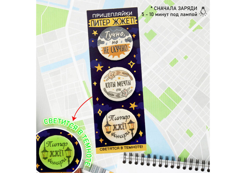 Поверхность значков покрыта люминесцентным лаком, что и обеспечивает светонакопительный эффект. Перед использованием рекомендуется подержать значок под источником направленного света в течение 5–10 минут — это активирует светонакопительное покрытие и сделает значок ярким даже в темноте.