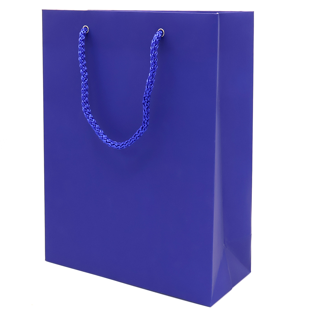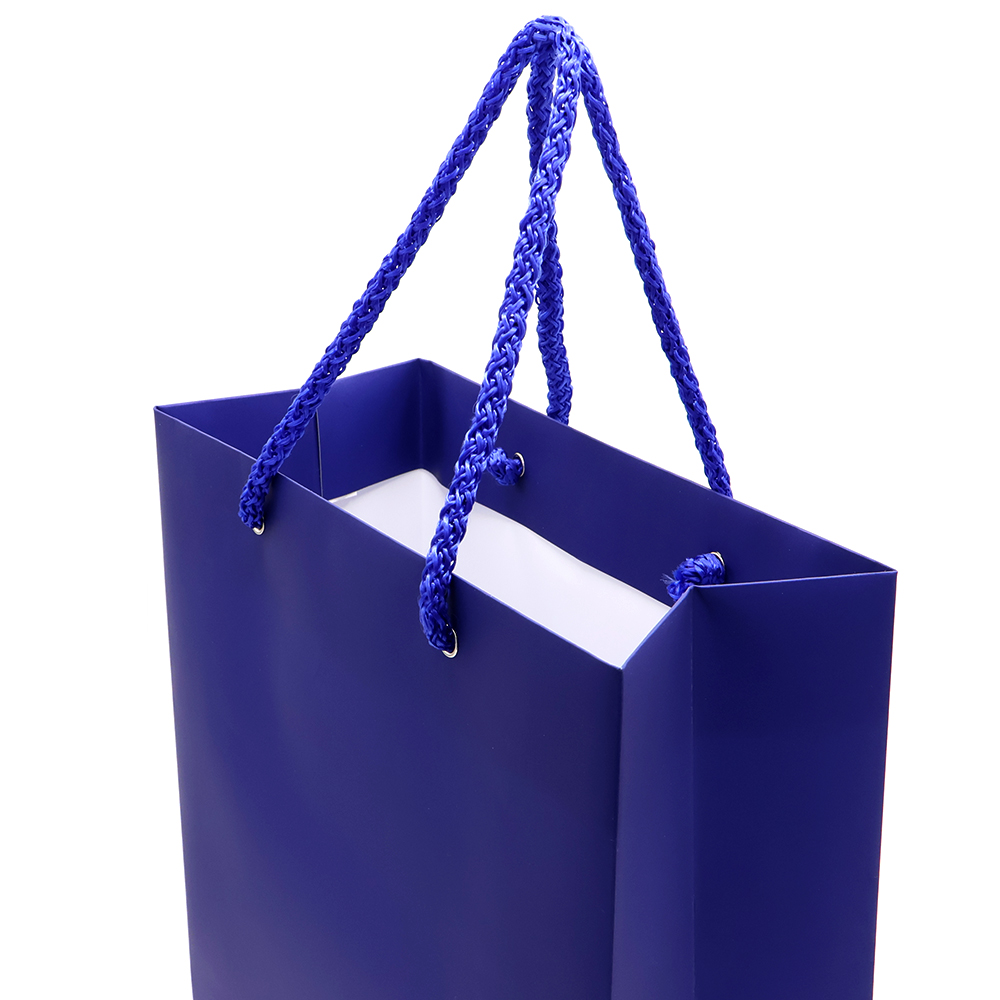 Бумажный пакет плотностью 170 г/м². Покрытие софт-тач. Шнур 6 мм синего цвета. Люверс — серебристый.