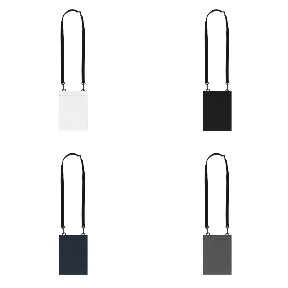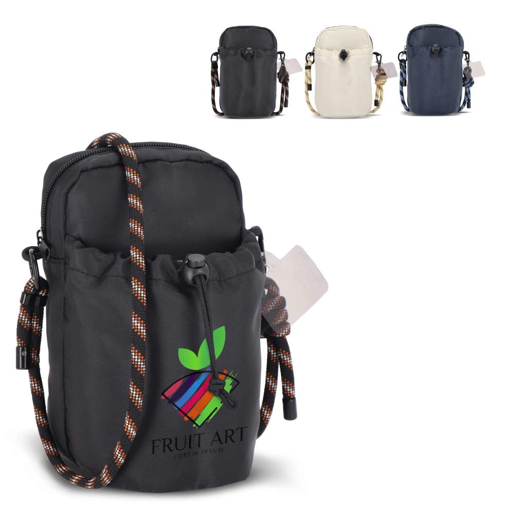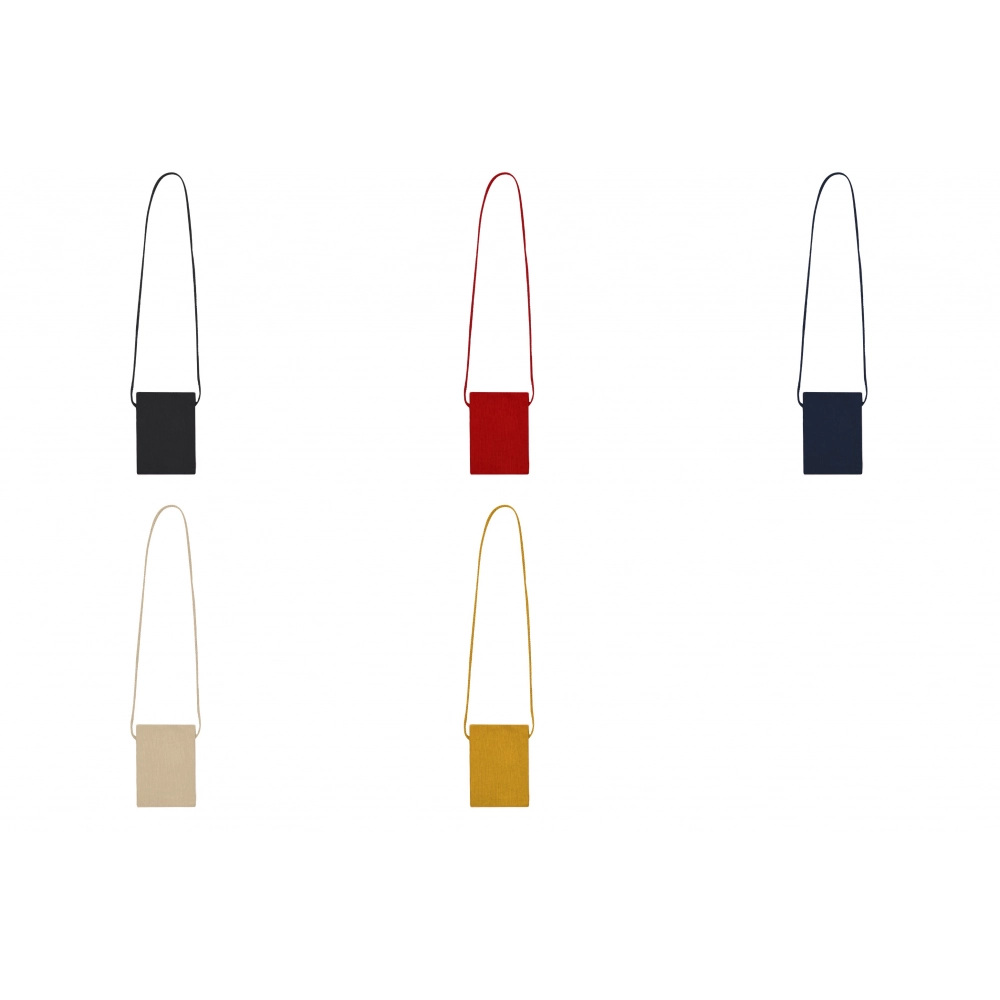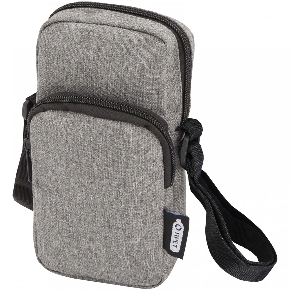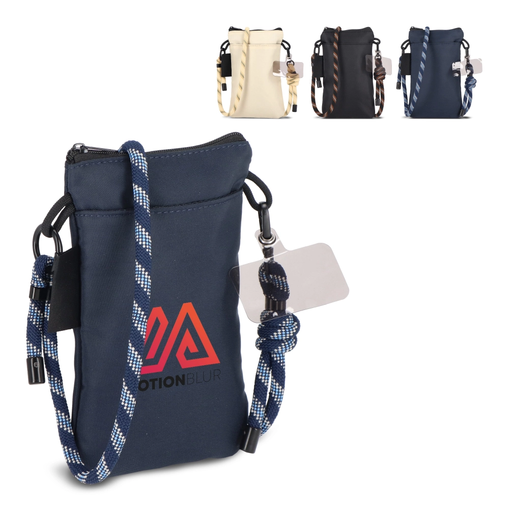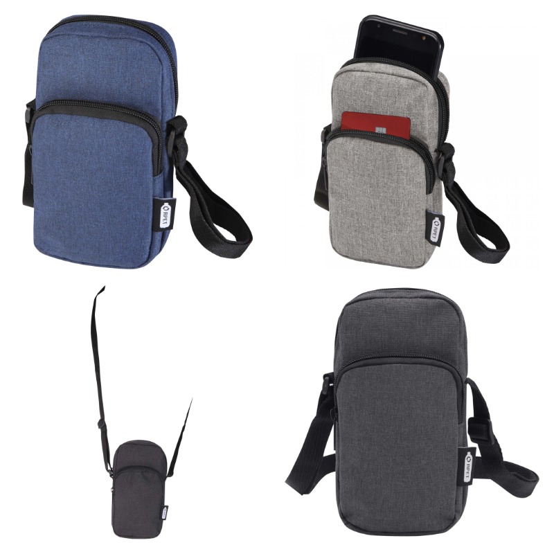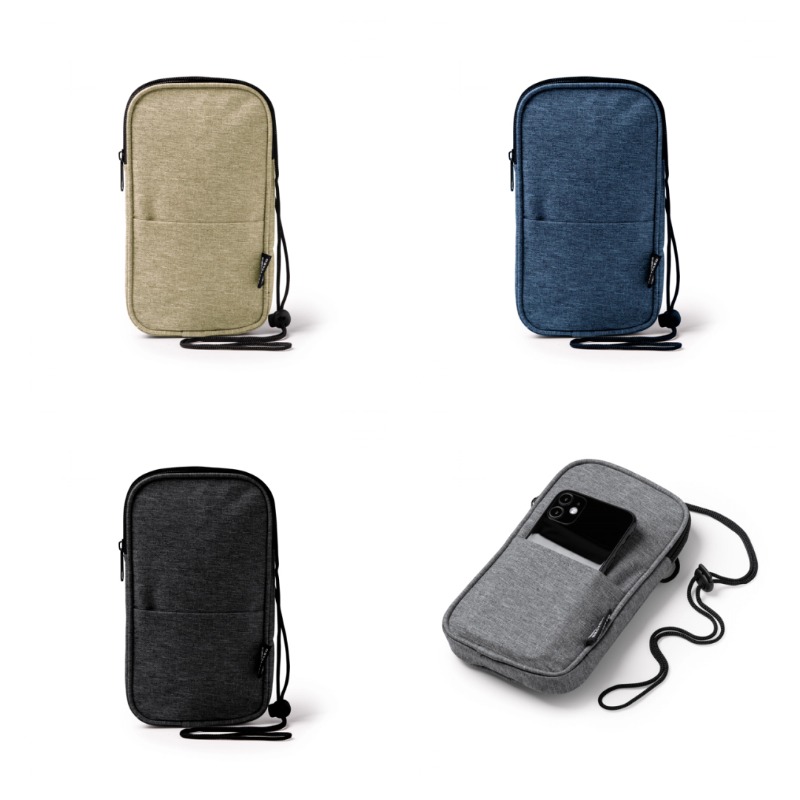 Мобильный чехол из RPET полиэстера. Основное отделение с соответствующей молнией. Внешний карман. В комплекте идет соответствующий ремешок для переноски.