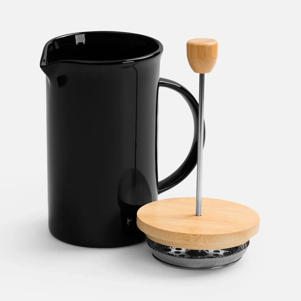 Элегантный керамический френч-пресс Mezzo в глянцевом черном исполнении — функциональный кухонный аксессуар и украшение любого пространства, от уютной домашней кухни до стильного офиса.