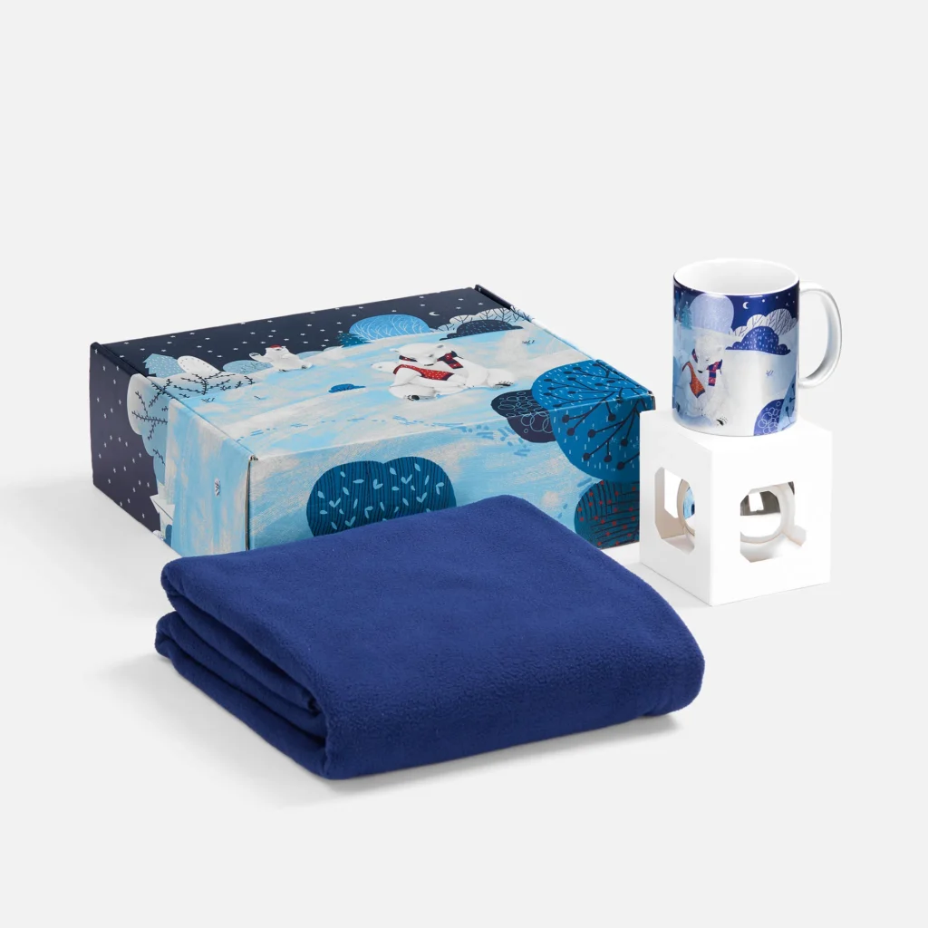 Набор «Праздничный полюс» приглашает окунуться в мир настоящей зимней эстетики и волшебной безмятежности! Это новогодний ансамбль в едином нарядном стиле: мягкий флисовый плед, кружка с тематическим принтом и изящный елочный шарик. Немного сказочные изображения с милыми белыми мишками на подарочной коробке и кружке задают тон всему набору, вызывая радость и улыбку.
