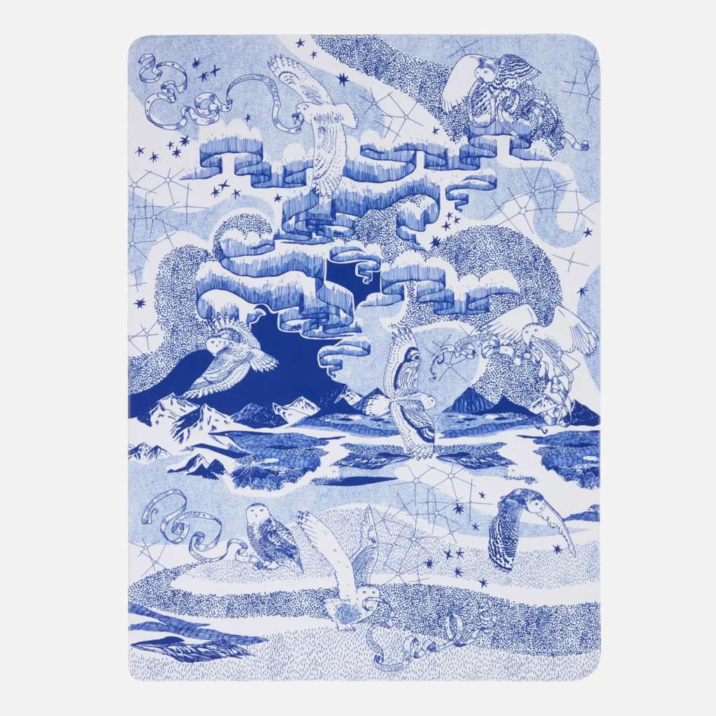 Подарочная упаковка и блокнот украшены чарующим детализированным изображением с совами на фоне бескрайнего горного пейзажа. Мудрые птицы несут на лентах важные послания с заветами на будущий год, а тончайшие линии выверенного рисунка создают неповторимое полотно северной сказки. Оттеняют магию Севера белоснежные шапка и шарф, которые подарят ощущение чистого зимнего утра и непередаваемого комфорта.