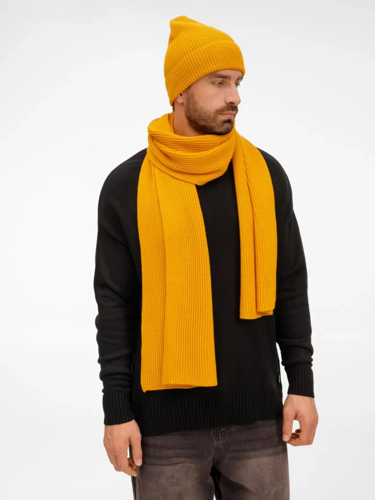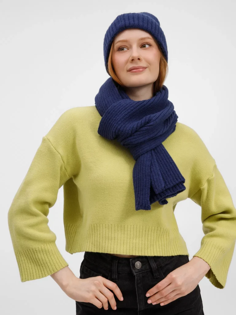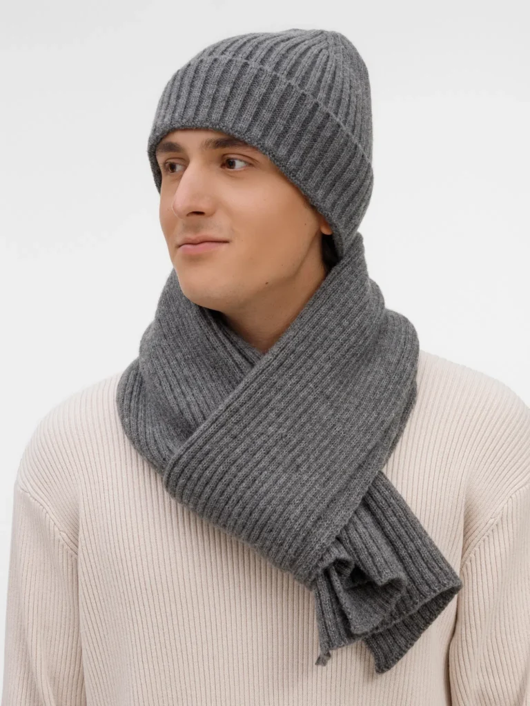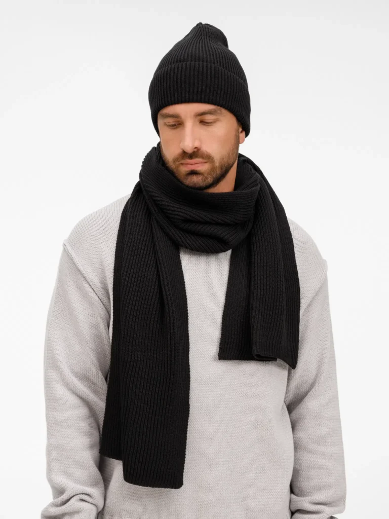 Шапку можно носить двумя способами: плотно прилегающей к голове или слегка приподнятой на макушке для создания современного силуэта. Шарф оптимальной длины и ширины позволяет экспериментировать с вариантами драпировки. Набор станет идеальным спутником для городских прогулок и поможет создать элегантный образ без лишних деталей.